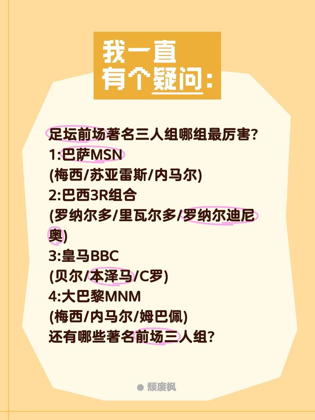 足坛哪组前场三人组最厉害?足坛前场著名三人组哪组最厉害? 1:巴萨MSN (梅西/苏亚雷斯/内马尔) 2:巴西3R组合 (罗纳尔多/里瓦尔多/罗纳尔迪尼奥) 3:皇马BBC (贝尔/本泽马/C罗) 4:大巴黎MNM (梅西/内马尔/姆巴佩) 还有哪些著名前场三人组?足球 足球的魅力 梅西 C罗