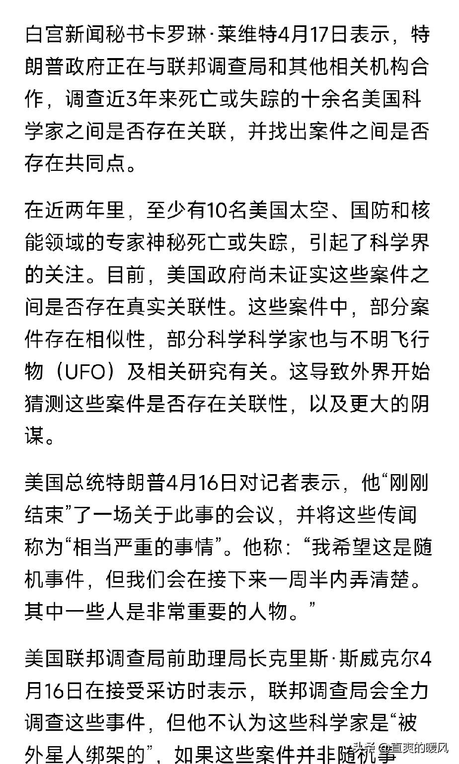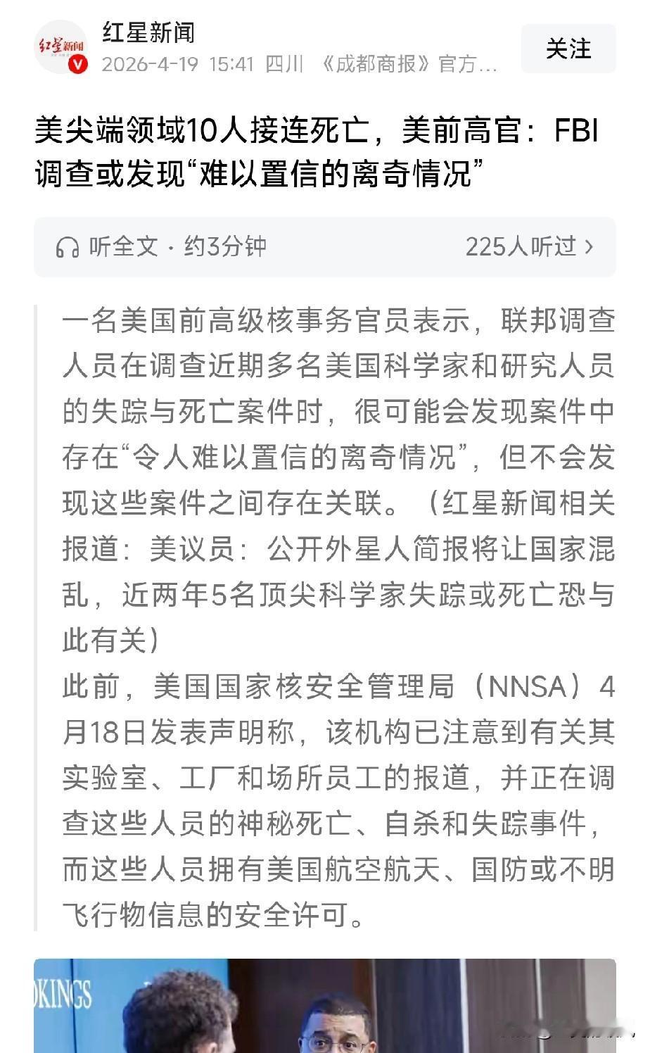 美国近两年,至少有10名太空、国防和核能领域的专家神秘死亡或失踪。 这里的专家是真正的专家,都是这些领域的佼佼者!精英中的精英,突然连续失踪或死亡,真的很离奇! 现在美国已经开始调查原因,后续不知会有什么回应。 网络上出现多种讨论与猜测,部分说法关联UFO现象、国际博弈等方向,比如有人认为这是美国内部利益纠纷,就像泼坦案一样,牵扯很深,还有人猜测,也许和俄罗斯有关,但均无权威实锤,属于不可信的言论。 后续官方会给出怎样的解释,事件背后是否存在隐情,值得持续关注。死亡的科学家