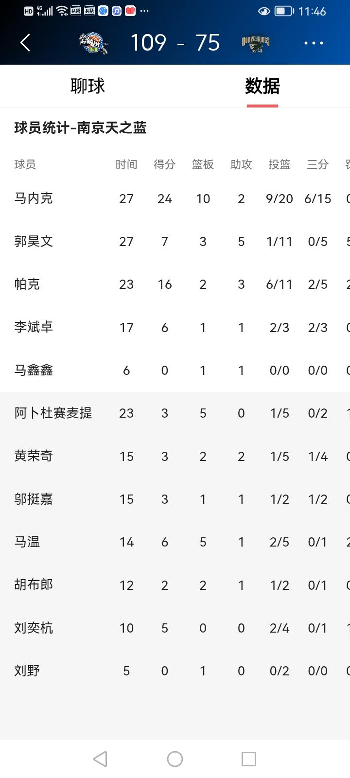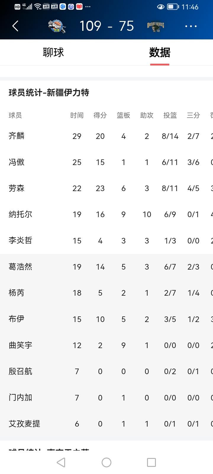 新疆队主场以109:75大胜南京队 昨晚新疆队在主场与南京天之蓝进行了第40轮比赛。新疆队多点开花,碾压式地战胜了南京队,结束了4连败,也算是给喜欢的球迷一个满意的交代。 这场比赛堪称一场酣畅淋漓的胜利。从开场哨响,新疆队就展现出了十足的斗志。球员们在球场上奔跑如飞,配合默契。进攻端,各个位置的球员都能高效得分,无论是内线的强力强攻,还是外线的精准远投,都让南京队防不胜防。 比赛中,新疆队的防守也十分强硬。重点对郭昊文帕克马内克等人加强了防守,成功限制住了南京队的得分机会,让对手的进攻屡屡受挫。尤其是下半场,新疆队的优势愈发明显,将分差越拉越大。最终,新疆队以109:75赢了南京天之篮。 从双方数据分析,新疆队齐麟冯傲劳森纳托尔葛浩然布伊6人得分上双,南京队只有马内克和帕克2人得分上双。可以毫不夸张的说,新疆队全员大爆发,无论是外援还是国内球员,信心爆棚,活力四射,合力打出了新疆队的精气神,给喜欢的球迷奉献了一场十分精彩的比赛。 值得一提的是,李炎哲带着眼伤作战,从罚球一只左眼努力而睁可以看到,其雄心壮志和不服输的精神令人佩服;而外援门内加却是应付差事,出工不出力,上场7分钟拿下了零分,只有1个篮板球。这让我想起了新疆原来的外援克里克,两人太相像了。 接下来新疆队要在客场挑战青岛队,输赢先不管,只是希望球员不要再受伤了。新疆队再也伤不起了。