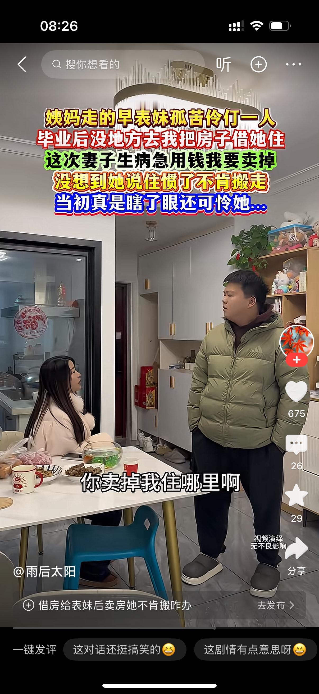 姨妈走的早,表哥看表妹一个人孤苦伶仃,毕业后也没好去处,就把房子借给她住。突然有一天,表哥的妻子生病住院,需要一大笔医药费。表哥对表妹说,你嫂子生病要花钱,这个房子我要卖了。你收拾一下,准备搬出去。表妹却说,这个房子我住了这么多年,我都住习惯了。你卖掉我住哪里啊?表哥很无语,问她,你什么意思?我要管你一辈子吗?表妹脸都绿了。