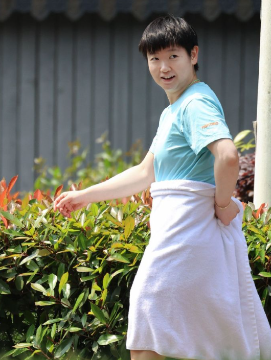 这就是大家喜欢孙颖莎的原因,没有一点偶像包袱,把浴巾裹在腰上,就这么萌萌的奔向训练馆