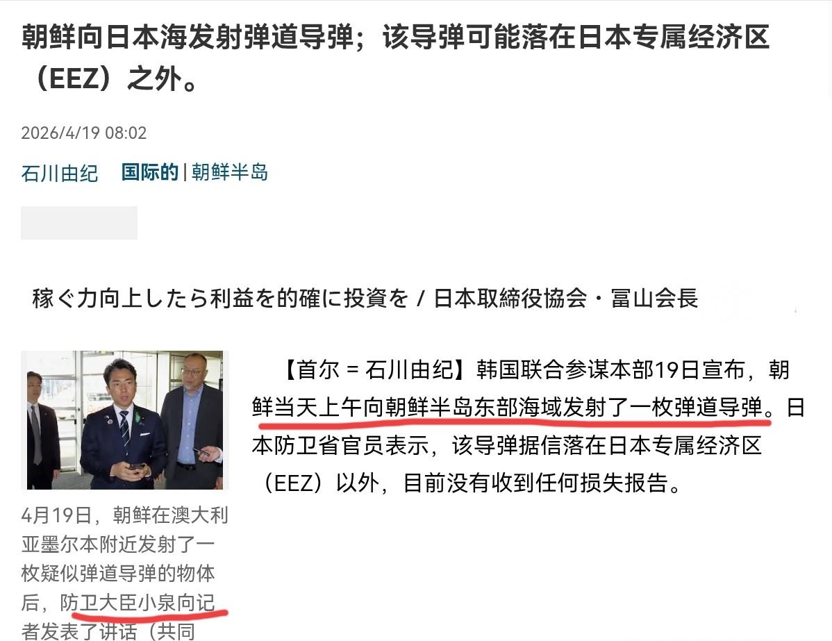 就在刚刚, 日本防卫大臣小泉进次发表声明, 4月19日,针对日本军舰刚挑衅性的经过台湾海峡,朝鲜直接朝日本经济海域方向发射导弹,日本防卫大臣小泉进次郎紧急出来表态回应:日方将继续全力以赴、妥善做好危机管理应对工作。 4月17日,日本海上自卫队的“雷”号驱逐舰悄悄驶入台湾海峡北口,这艘挂着旭日旗的军舰没有选择快速通过,而是以18节的慢速在台海海域游荡,直到当天傍晚5点50分才从南口驶出,全程耗时近14个小时,创下近年日舰在台海逗留时长的新纪录。 日方在航行期间关闭了船舶自动识别系统,雷达保持战备状态,还伴有P-3C反潜机配合侦察,所谓“前往菲律宾参加美菲军演”的借口,不过是掩人耳目的幌子。 中国东部战区当天迅速做出反应,组织海空兵力全程跟监警戒,实施有效规制管控。外交部发言人郭嘉昆在例行记者会上明确指出,日方派自卫队舰艇进入台湾海峡,耀武扬威、蓄意挑衅,是错上加错。 这次行动发生在《马关条约》签订131周年的敏感日子,日本选择在这一天挑衅性穿越台海,其政治象征意义不言而喻。 就在全世界还在消化日本穿越台海这一事件所带来的冲击时,仅仅过了不到48小时,另一枚“震撼弹”在东北亚引爆。2026年4月19日清晨6点10分,朝鲜咸镜南道新浦一带传来巨响,数枚弹道导弹拖着尾焰升空,朝着朝鲜半岛东部海域,也就是日本海的方向飞去。 韩国联合参谋本部监测到的数据显示,导弹飞行了大约140公里后坠落,日本防卫省随后确认,导弹最终落在了日本专属经济区之外的海域,目前没有收到任何关于船只或飞机受损的报告。这是朝鲜在2026年进行的第七次弹道导弹发射活动,距离上一次4月8日的发射不足两周。 导弹发射的消息,以最快的速度传到了正在澳大利亚访问的日本防卫大臣小泉进次郎耳中。这位肩负国防重任的大臣,当时的行程本应是推进日澳军事合作,然而朝鲜的导弹打破了一切计划。 小泉进次郎立刻在澳大利亚墨尔本机场召集媒体,举行了一场仓促而紧急的记者见面会。面对镜头,他首先通报了朝鲜发射“数枚可能是弹道导弹的武器”这一情况,着重强调经过核实,导弹落在了日本专属经济区之外,目前没有损失报告。他表示日本将与美国、韩国紧密合作,并密切监视,以防发生不测事态。 很多人说这两件事只是巧合,八竿子打不着。可我要告诉大家,天底下哪有这么巧的事?日本前脚在台海挑事,朝鲜后脚就朝着日本方向发射导弹,时间差不到24小时。这根本不是什么巧合,这是朝鲜给日本的一记响亮耳光,是对日本在亚太地区到处煽风点火的最直接回应。 朝鲜这次导弹发射,虽然落在日本专属经济区之外,但方向明确指向日本海,发射时间选择在日本挑衅台海后的第二天,这其中的信号再明显不过。朝鲜向来以强硬回应著称,对于日本在亚太地区的军事扩张和挑衅行为,朝鲜用最直接的方式给出了回应。这不是简单的武器试射,而是地缘政治博弈中的一次精准打击。 日本防卫大臣小泉进次郎在澳大利亚的紧急表态,表面上看是应对朝鲜导弹威胁,实际上是在为自己的挑衅行为买单。当日本的军事触角伸向敏感的台湾海峡时,它就应该预料到会立刻迎来如此直接而强硬的回应。 朝鲜的导弹,既是在试射武器,更是在向日本传递一个不容误解的信号:在亚太地区煽风点火,就要准备好承受相应的后果。 对于中国来说,这次事件再次证明在台海问题上必须保持高度警惕。日本军舰在台海长达14小时的慢速巡航,关闭识别系统,保持战备状态,这已经超出了正常航行的范畴,是赤裸裸的军事挑衅。 中国东部战区组织海空兵力全程跟监警戒,实施有效规制管控,展现了维护国家主权和领土完整的坚定决心。外交部已向日方提出强烈抗议,要求停止此类举动。 东亚地区的和平稳定需要各方共同维护,任何一方的单边挑衅都会破坏地区平衡。日本在历史问题上缺乏深刻反省,在军事扩张上却步伐加快,这种危险倾向必须引起国际社会的高度警惕。朝鲜的导弹回应虽然方式直接,但也从一个侧面反映了地区国家对日本军事扩张的担忧和反对。 这次台海与日本海的联动事件,不是孤立的现象,而是亚太地区地缘政治格局变化的缩影。日本想要通过军事手段扩大在地区的影响力,就必须准备好承受相应的反制。朝鲜用导弹划出的那道弧线,不仅是对日本的警告,也是对所有在亚太地区制造紧张局势的势力的警示:和平来之不易,挑衅必遭反击。