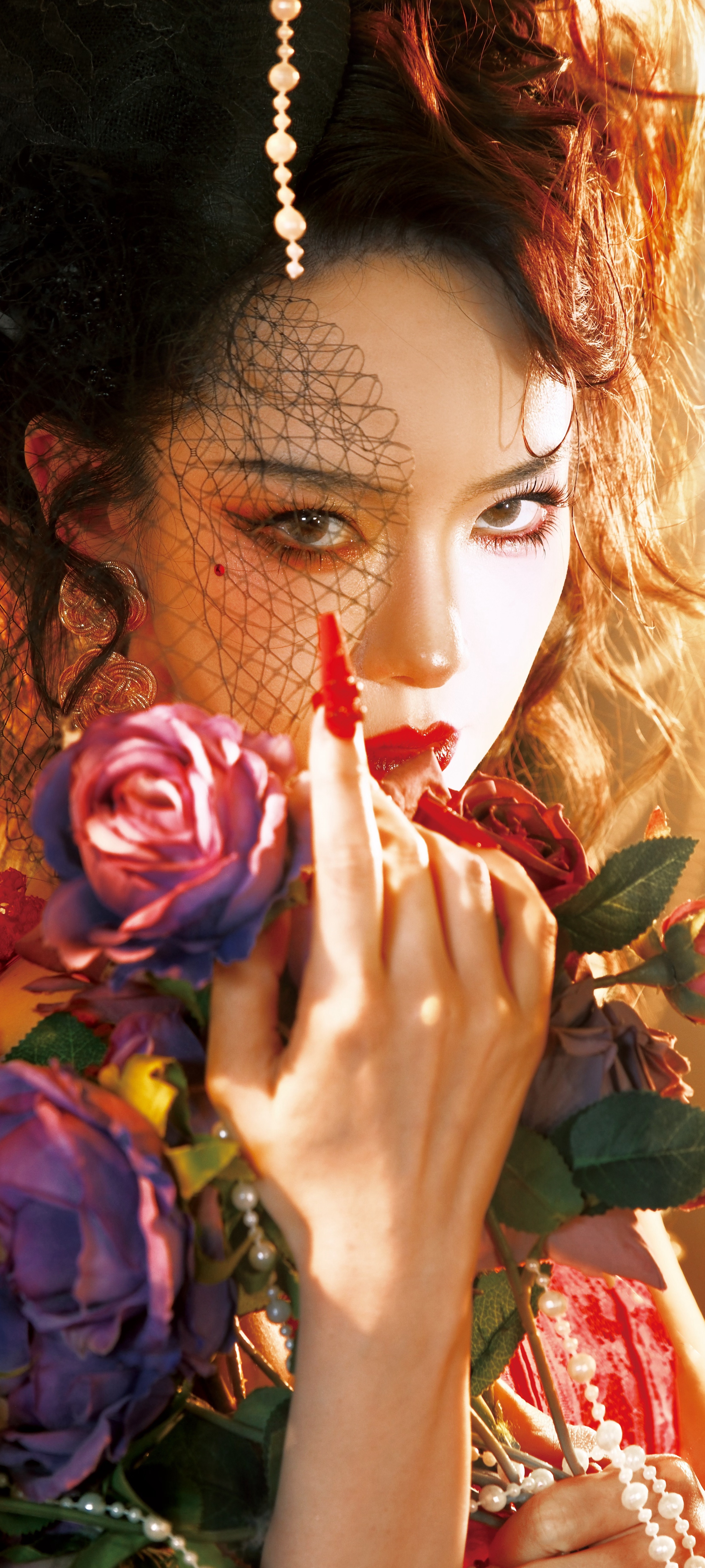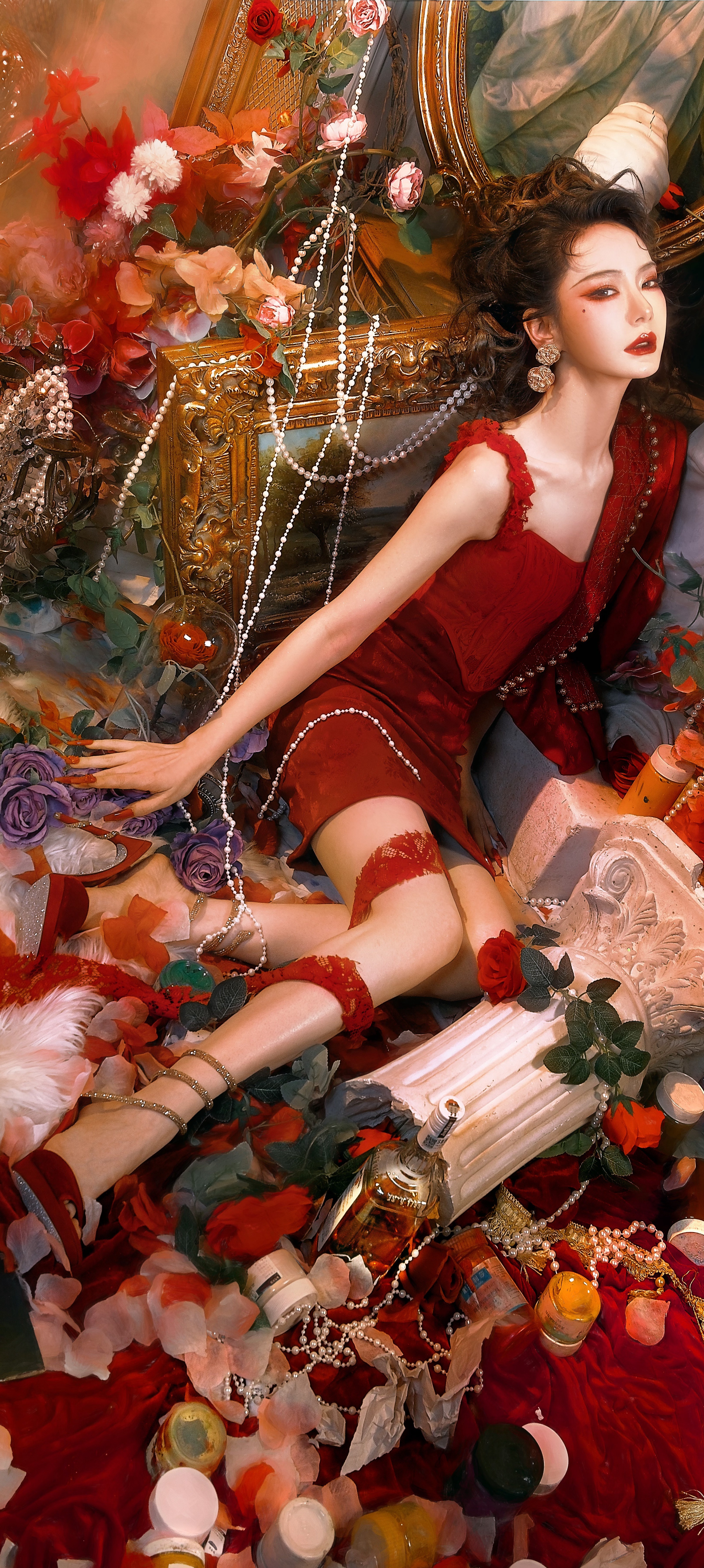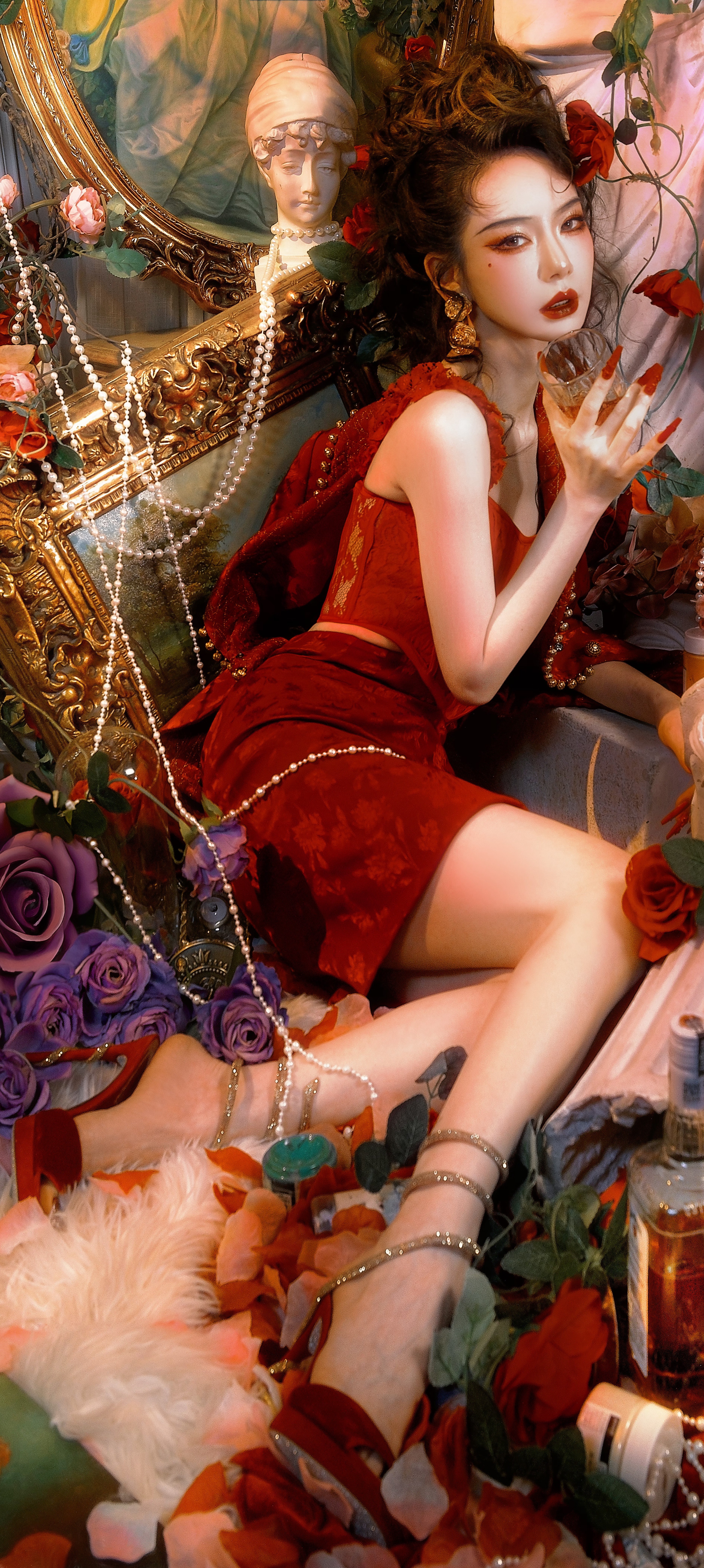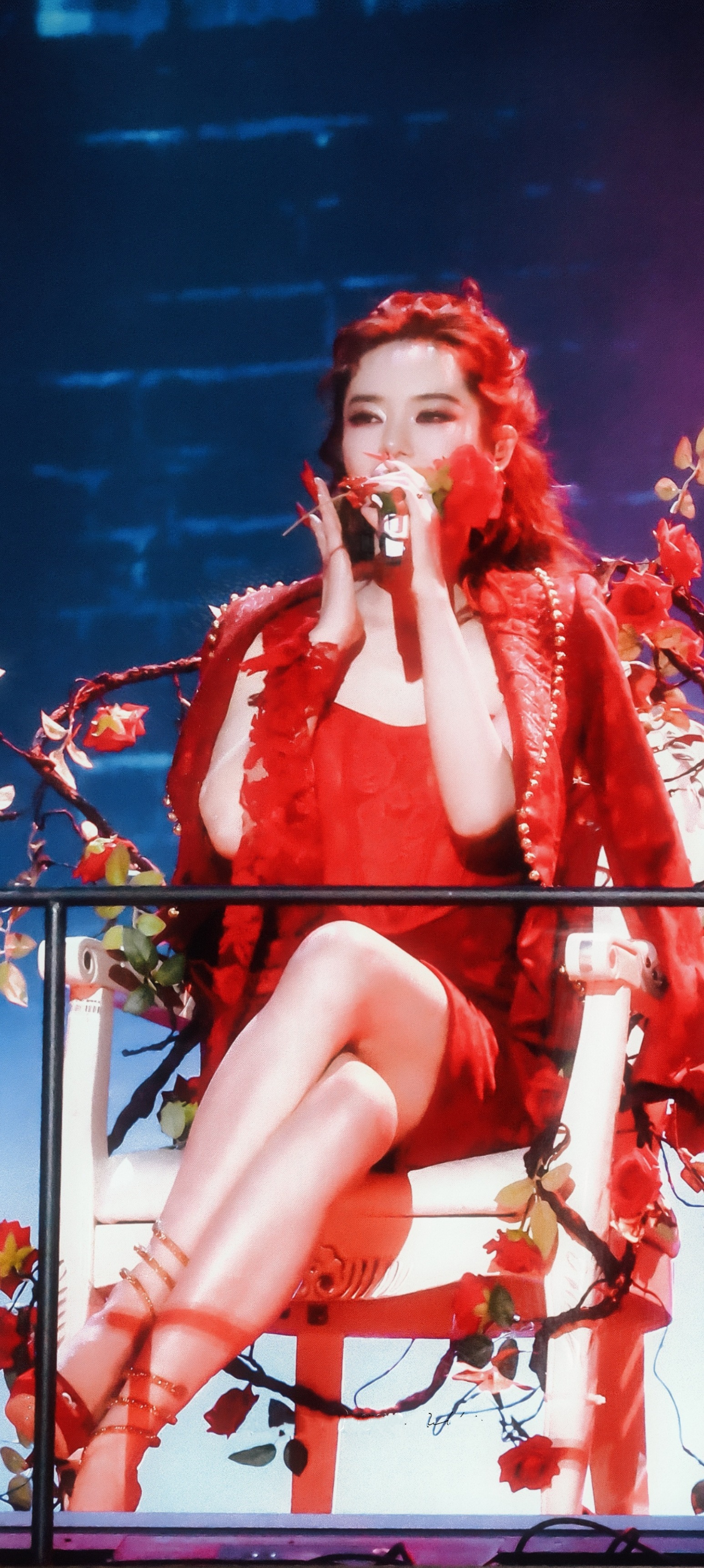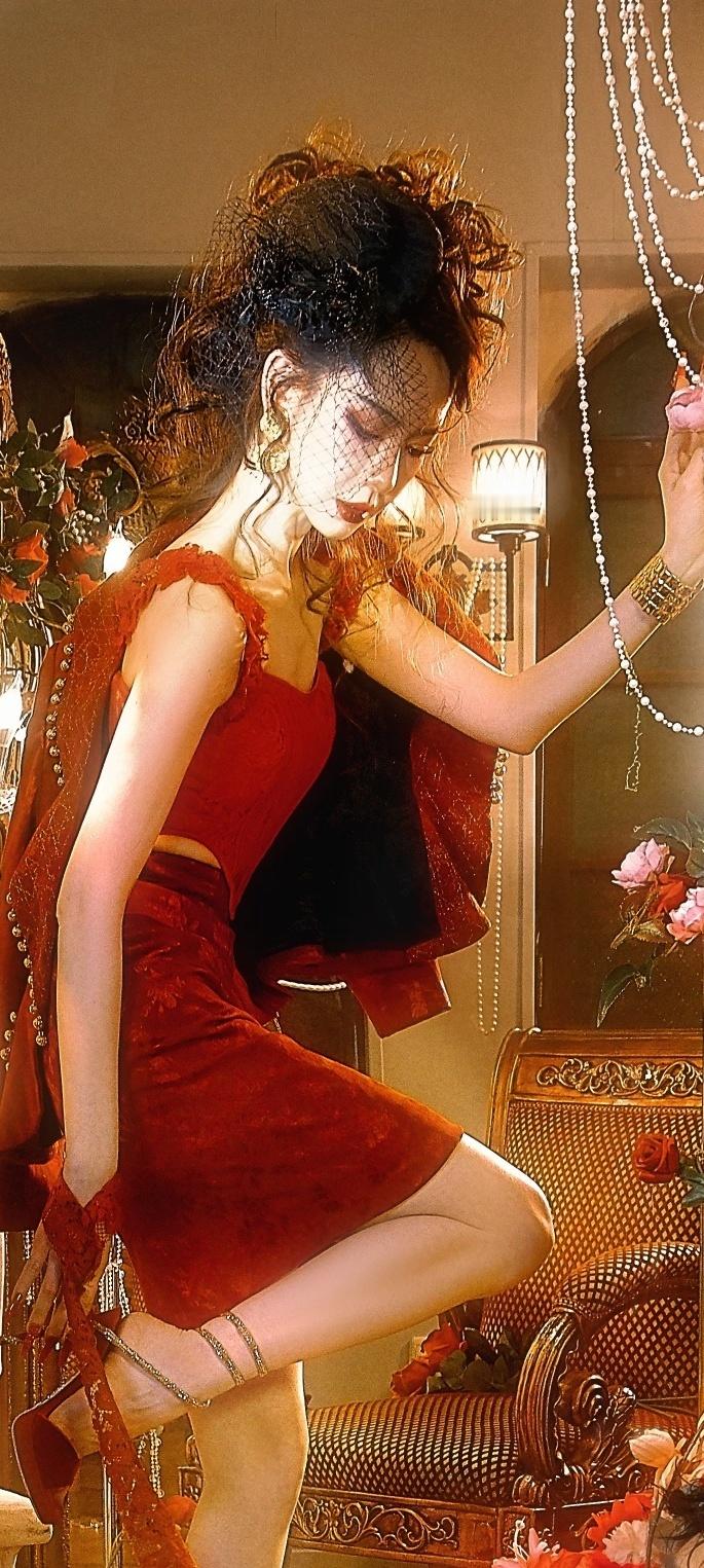 戚薇红裙穿搭壁纸,长腿配丝绒高跟鞋,酷美热烈。戚薇