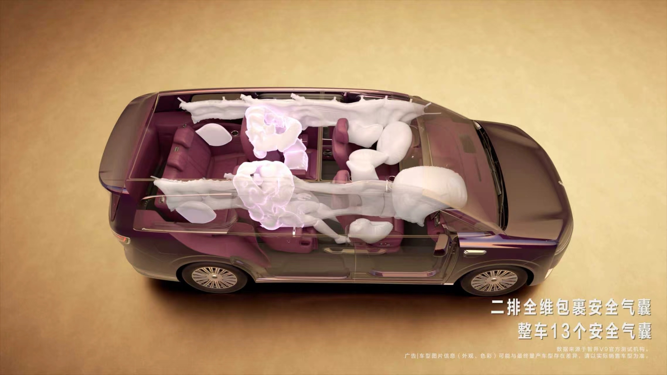 智界V9首发同级最多安全气囊智界V9搭载全车满配同级最多13个安全气囊,不是简单堆数量,每个气囊都有明确分工,再加上全球首发全维包裹安全气囊这一黑科技,配合最强车身的硬核结构,前排到三排全有专属侧气囊、气帘覆盖拉满,实现全姿态全座舱防护,这就是安全平权,不分座位远近,上车就一视同仁。