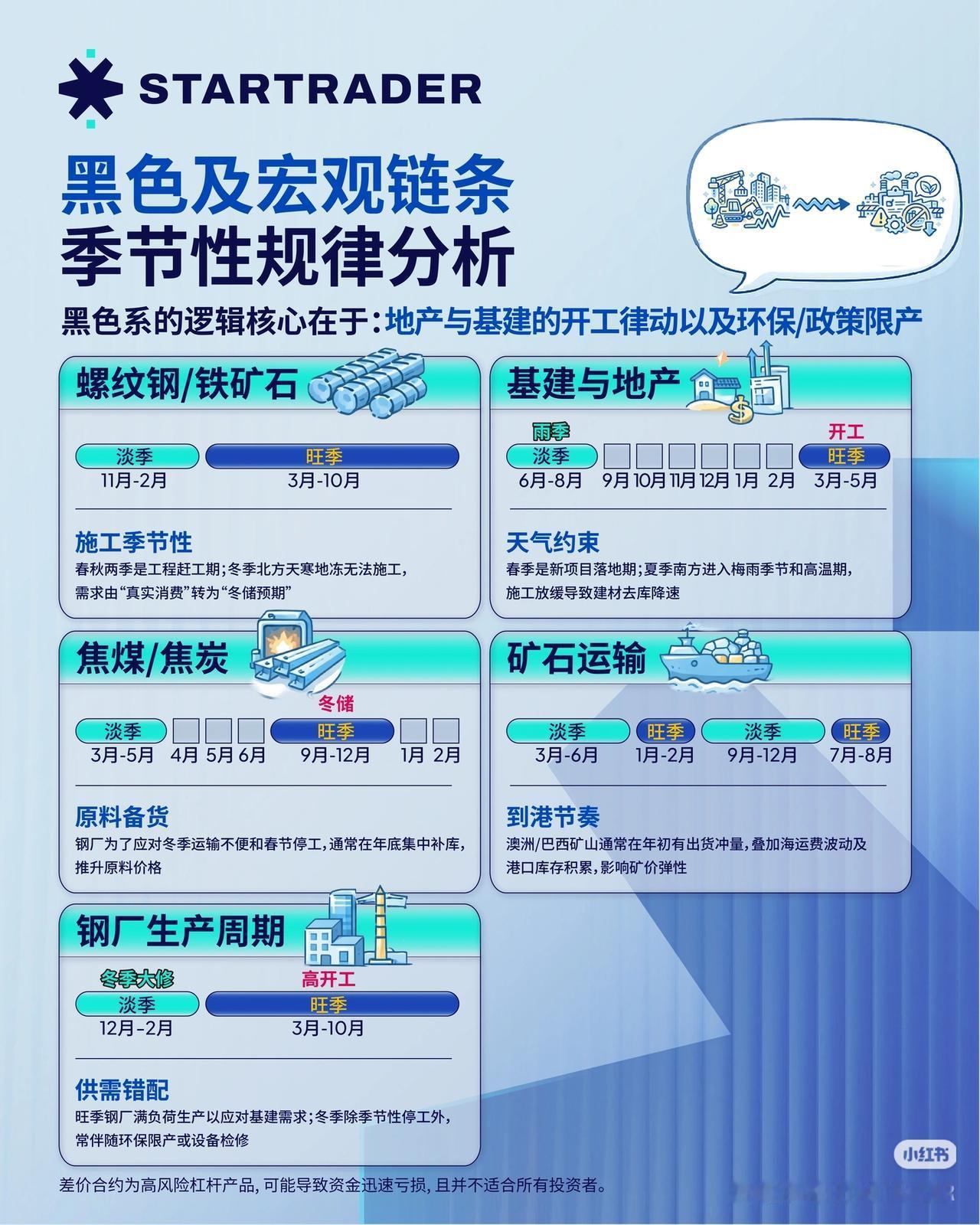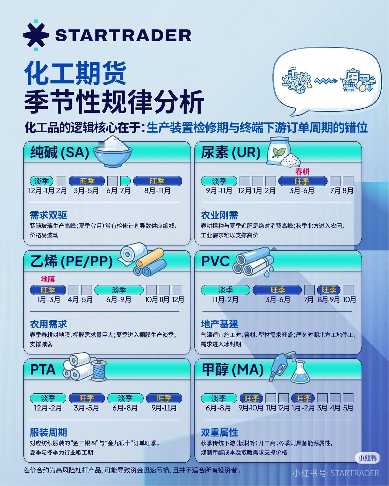 搞懂商品期货的“季节密码”!普通人也能看懂的涨跌规律 商品价格不是乱波动的,背后藏着清晰的季节性规律。今天用大白话,把农产品、化工、黑色系的涨跌节奏讲透,看完你就知道什么时候该关注什么品种! 🌽 农产品:跟着天气和节日走 核心逻辑:天气+生长周期+节日需求 - 生猪:年底/春节前是消费旺季,价格易涨;年中供应增加,价格承压。 - 苹果:8-10月入库周期是旺季,库存消化期价格波动强。 - 白糖:10月-次年3月是消费旺季,节假日需求带动明显。 - 鸡蛋:春节、中秋前备货需求高,夏季高温产蛋率低,价格易波动。 ⚗️ 化工品:跟着开工和订单走 核心逻辑:生产装置检修期+终端订单周期的错位 - 纯碱:3-5月、8-11月是旺季,跟随玻璃生产高峰,夏季检修易致供应收缩。 - 尿素:3-6月春耕是旺季,秋季农闲后需求支撑减弱。 - PVC:3-6月、7-10月是旺季,气温适宜施工,管材型材需求旺盛。 - 甲醇:9-10月、1-2月是旺季,秋季开工高+冬季备库需求支撑价格。 🏗️ 黑色系:跟着开工和政策走 核心逻辑:地产基建开工+环保限产+钢厂生产周期 - 螺纹钢/铁矿石:3-10月是施工旺季,需求随基建地产开工节奏波动。 - 焦煤/焦炭:9-12月冬储是旺季,钢厂年底补库推升原料价格。 - 钢厂生产周期:3-10月是高开工旺季,冬季大修期供应收缩。 商品投资不是靠猜,而是靠读懂供需节奏。搞懂这些季节性规律,你就能比别人早一步把握机会! 觉得有用的朋友,点赞收藏起来,下次再看商品,你就知道什么时候该重点关注了!你最看好哪个品种的机会?评论区聊聊! ⚠️ 风险提示:本文仅为行业规律科普,不构成任何投资建议。市场有风险,投资需谨慎。