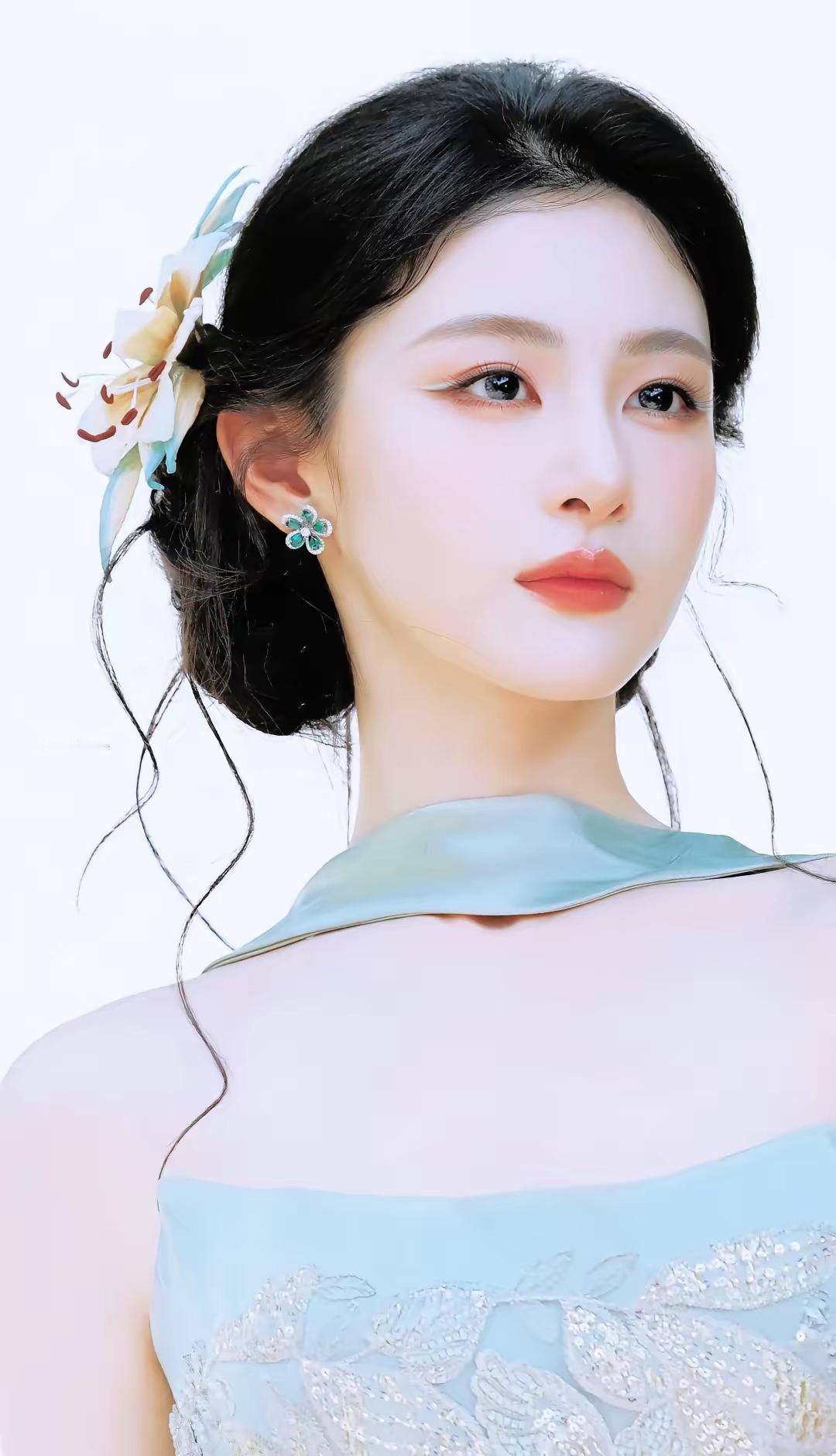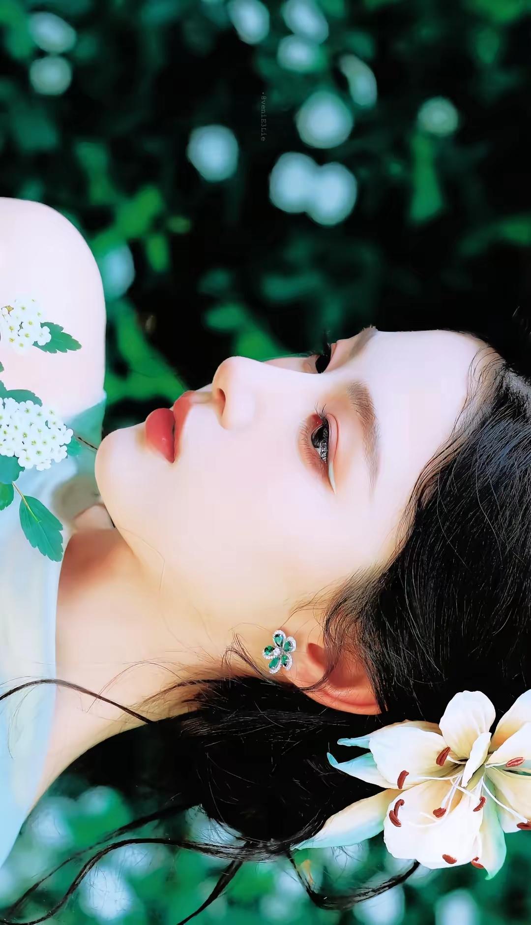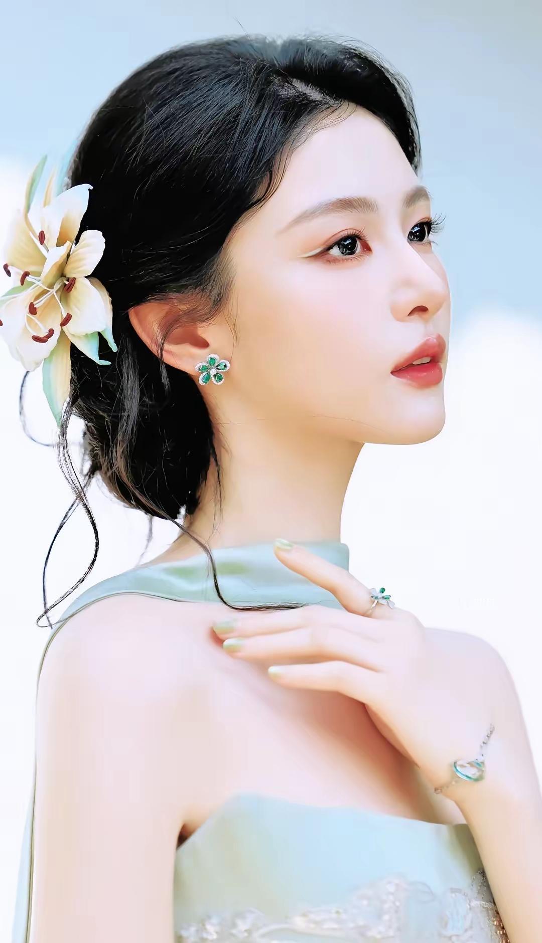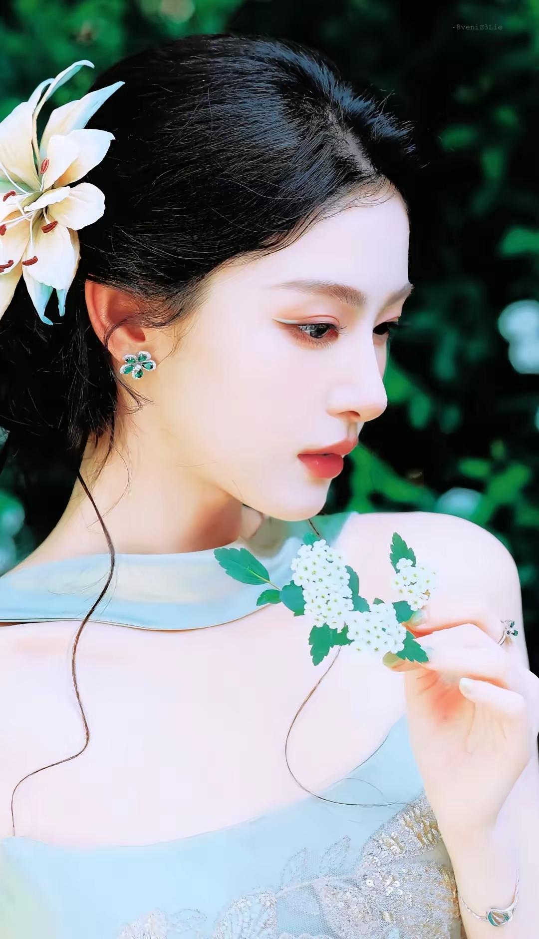 美女壁纸~赵晴,发间百合轻颤,淡蓝裙摆漾着柔光,眉眼间晕染着浅夏的清透与温柔 风携着绿意掠过,每一缕发丝都裹着春日的甜香,像从绿野里走出的花,带着不惹尘埃的明媚与诗意