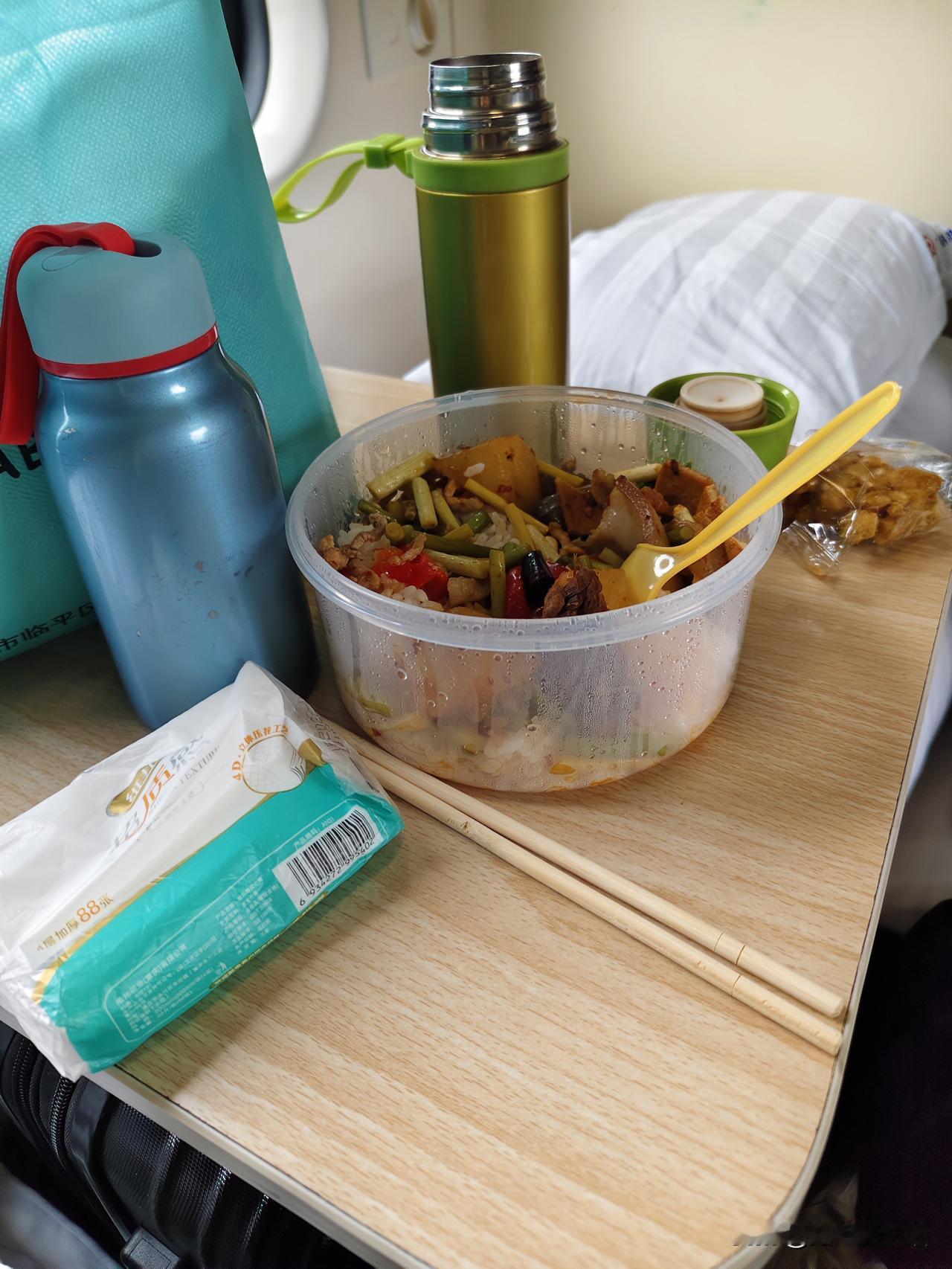收拾好屋子,用过早餐,出发啦! 今日成都阴天。因今日出行,昨晚睡得不太安稳,五点刚过便醒了。吃了每日必服的“雷替斯”药,七点多起床收拾屋子。 整理好床铺,煮好鸡蛋,用过早餐,八点多出门。时间充裕,便乘公交车前往成都西站。 抵达成都西站,拍了视频,接着去买快餐。自带饭盒的好处,就是能让老板用微波炉加热,带着热气腾腾的饭菜上了火车。 上了火车,安置妥当,11点14分,火车开动,我的长沙之行就此开启!