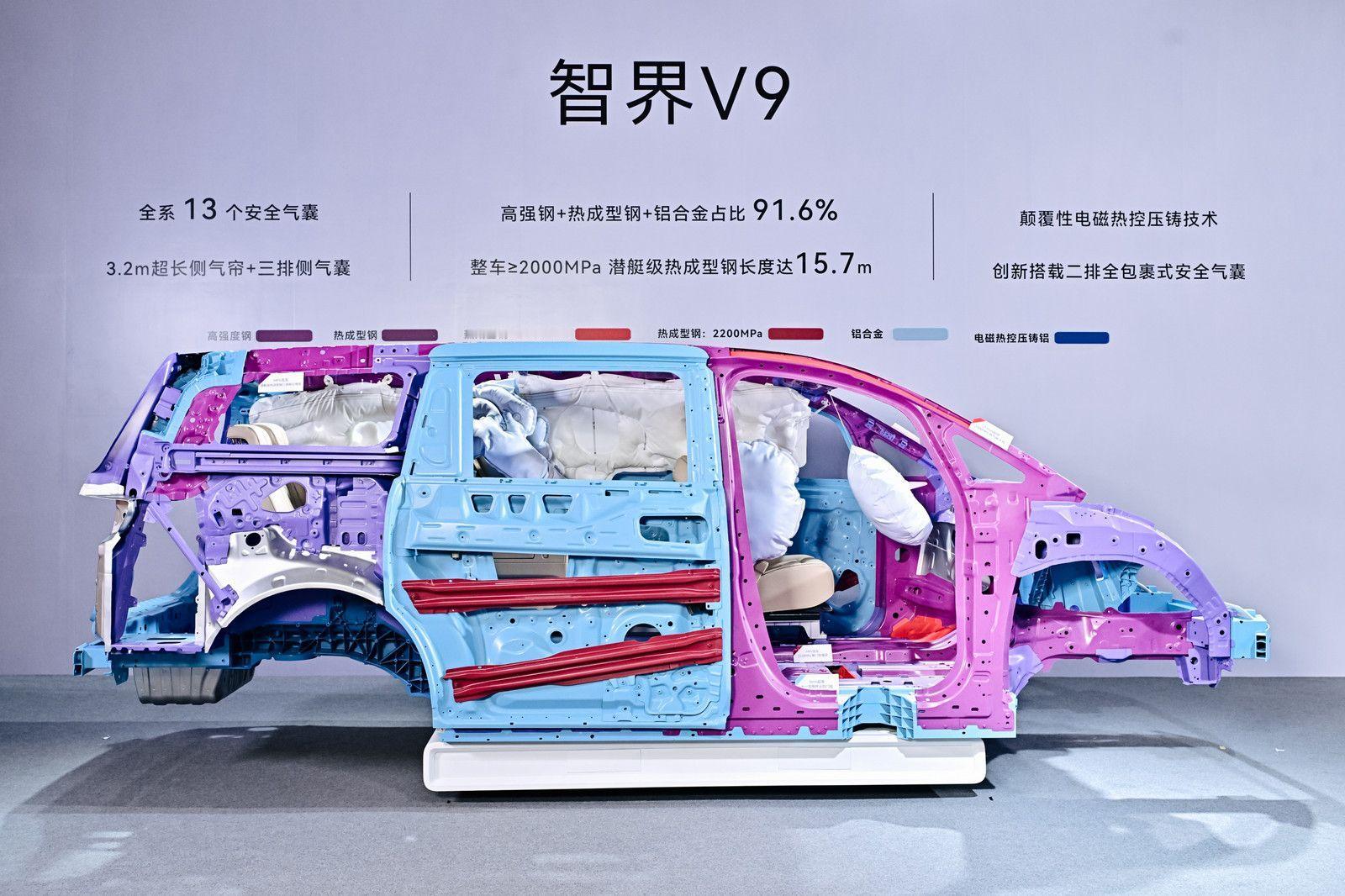 智界V9首发同级最多安全气囊很多人觉得高强度钢占比是数字游戏,可智界V9的最强车身绝非虚标,91.6%高强钢铝占比、15.7米两千兆帕以上热成型钢,全集中在关键传力节点,再搭配全球首发全维包裹安全气囊、全车满配同级最多13个安全气囊,在看不见的地方砸满成本,骨架密度远超普通MPV。