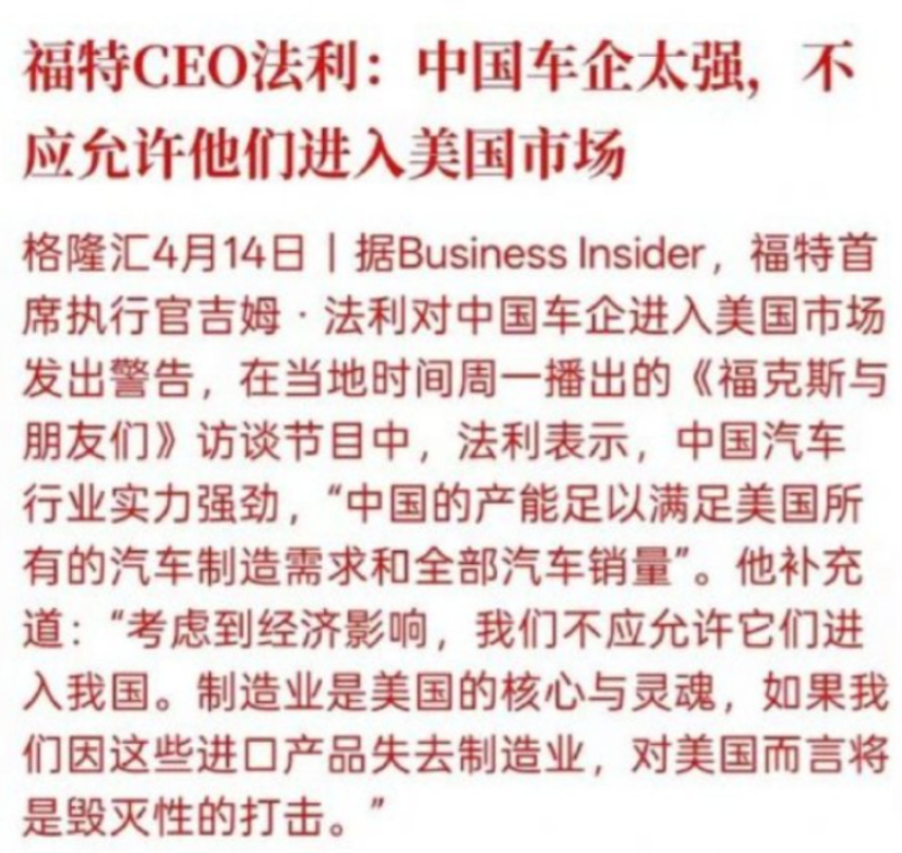 2026年4月13日,福特汽车CEO吉姆·法利坐进福克斯新闻《福克斯与朋友们》节目的演播厅。面对镜头,他语气强硬地说出一番话——“我们不应该让他们(中国车企)进入我们的国家”,并警告称如果允许中国汽车在美国销售,将对美国制造业造成“毁灭性打击”。