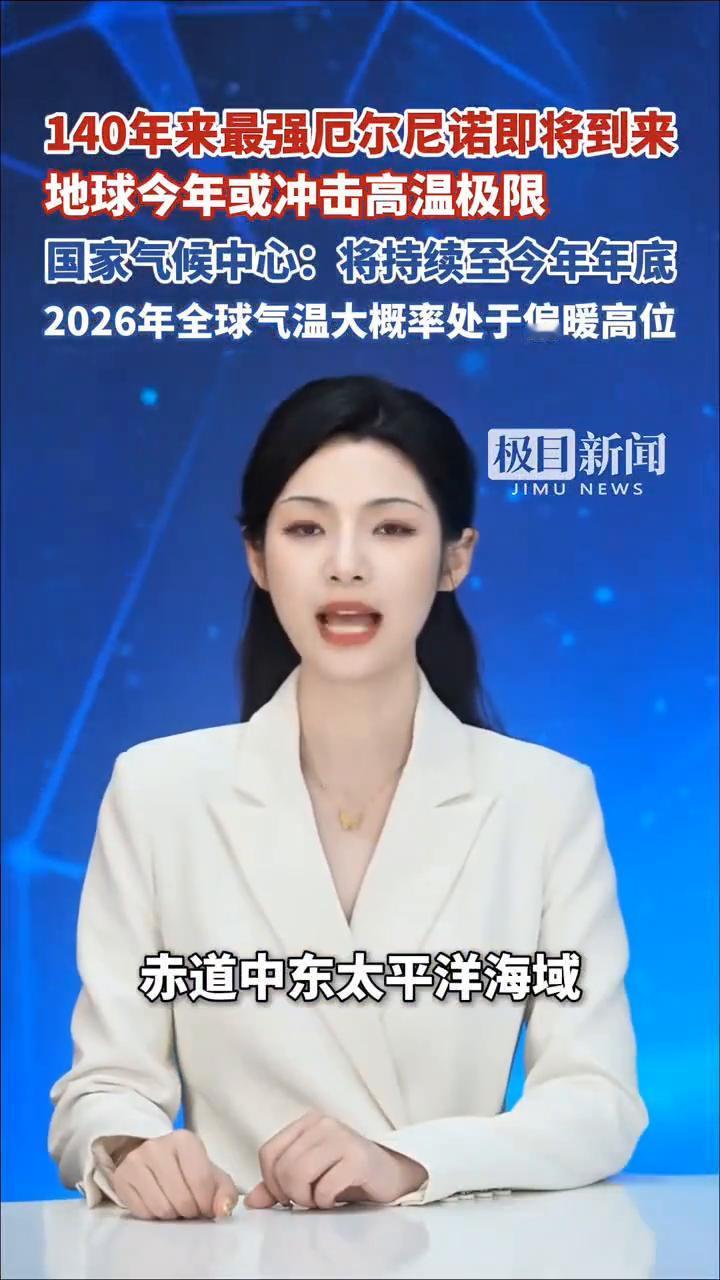 140年来最强厄尔尼诺即将到来,地球今年或冲击高温极限。国家气候中心:将持续至今年年底,2026年全球气温大概率处于偏暖高位。 极目新闻主播彭柳文。 140年来最强厄尔尼诺即将到来,地球今年或冲击高温极限。4月18日国家气候中心对此回应称,预计5月进入厄尔尼诺状态,并在夏秋季形成一次中等级以上强度的厄尔尼诺事件,将至少持续至今年年底。 厄尔尼诺是指赤道中东太平洋海域海水温度异常升高,从而影响大气环流的一种气候现象。它往往导致全球气温升高,并引起太平洋周边多个地区气候异常。目前赤道中东太平洋海表温度呈现持续升高趋势。国内外气象预报机构对今年进入厄尔尼诺状态的趋势预测高度一致,2026年全球气温大概率仍将处于偏暖高位。