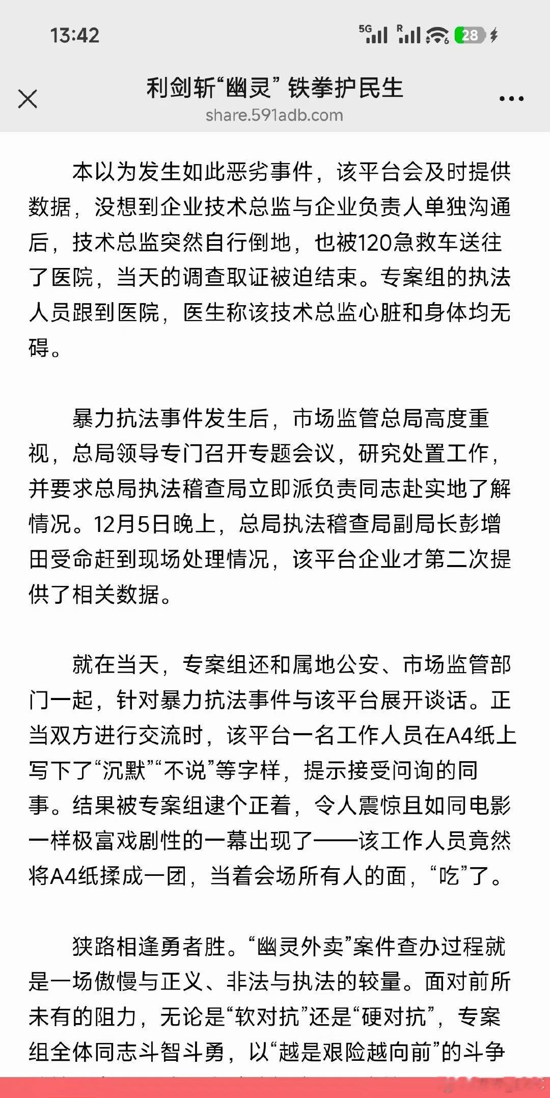 “手被企业员工故意挤压造成骨折”“该平台安保负责人情绪失控,带一群人冲击办案现场”“前一天骨折的执法人员,被迎面推到,头部重重的磕在地上”“技术总监突然自行倒地,医生检查发现无碍”“当着会场所有人的面,把A4纸吃了…..”