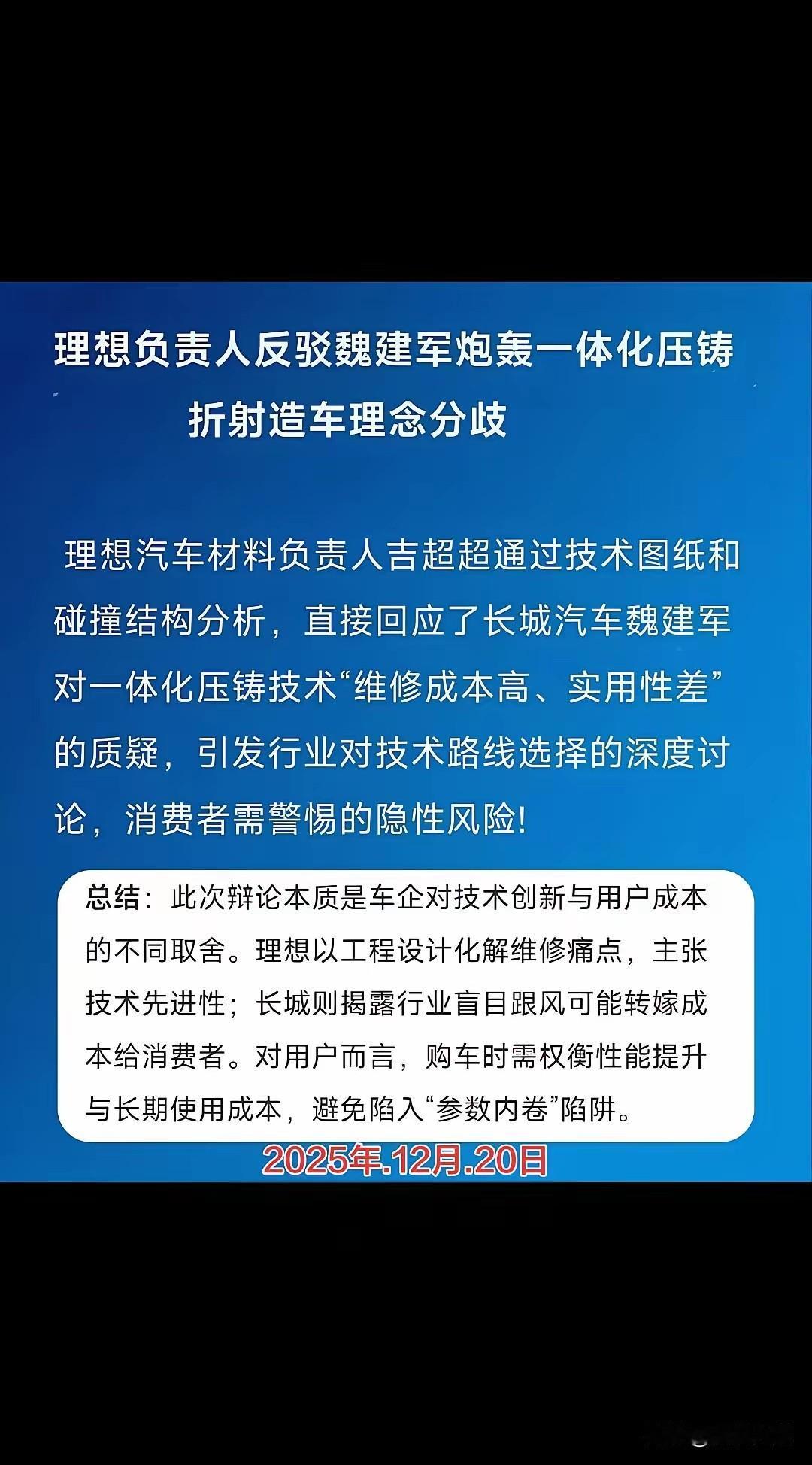 13万卡扣维修费,让魏建军去年的预言照进现实 近期,“新能源汽车换个卡扣要13万”的话题引爆全网:一辆20多万的新能源车,仅因电池包上一个成本不足百元的塑料卡扣断裂,厂家以“一体化密封不可拆分”为由,要求更换整个电池包,维修费直逼车价一半,车主直呼“修不起”。 而早在去年,长城汽车魏建军就公开质疑一体化压铸等技术:“成本高、不便利、不灵活,最终会把风险和成本转嫁给用户”。当时这番话被不少人当作“守旧言论”,如今却被现实一一验证。 车企端省下的制造成本,变成了车主端天价的维修账单;看似先进的一体化设计,在碰撞后却只能“一坏全换”。当行业都在追逐“降本噱头”时,魏建军早已站在用户全生命周期的角度,戳破了光鲜背后的隐患。