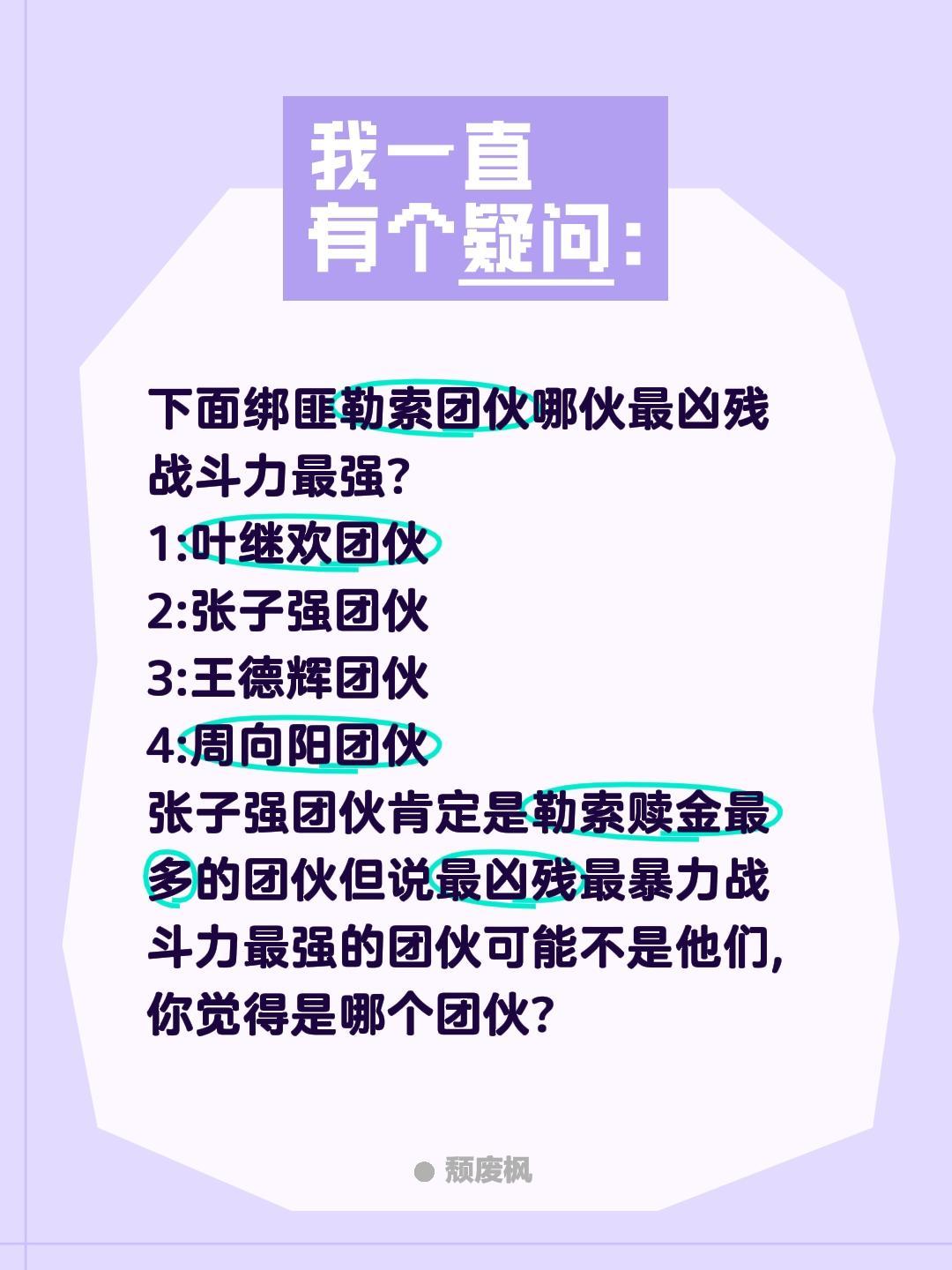 下面绑匪勒索团伙哪伙最凶残战斗力最强? 1:叶继欢团伙 2:张子强团伙 3:王德辉团伙 4:周向阳团伙 张子强团伙肯定是勒索赎金最多的团伙但说最凶残最暴力战斗力最强的团伙可能不是他们,你觉得是哪个团伙?故事 张子强 叶继欢 悍匪