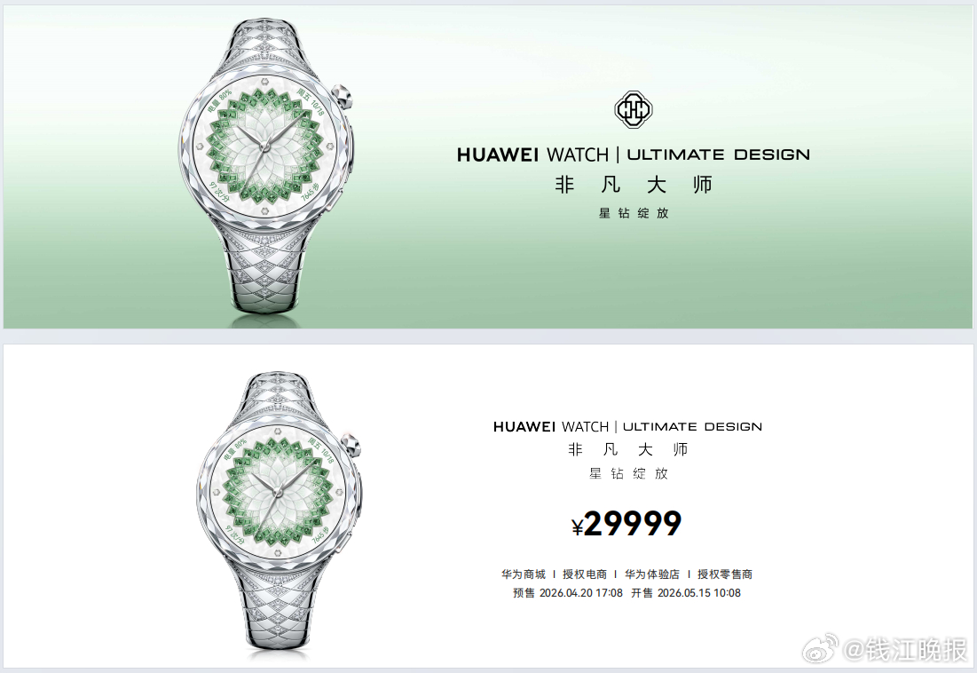 #华为非凡大师女表一分钟全部售罄# 华为首款珠宝智能腕表正式亮相!今日预售开启后1分钟售罄!国际超模刘雯出任HUAWEI WATCH 非凡大师星钻绽放品牌大使,以全球时尚影响力诠释东方女性力量。新品华为 WATCH ULTIMATE DESIGN 非凡大师 星钻绽放款,凝聚非凡美学:斐波那契黄金曲线设计、藤蔓镶钻表带、兰花钻石表冠,全表镶嵌99颗天然钻石尽显高级质感;健康方面搭载 X‑TAP 智感窗、多维情绪监测、女性专属健康管理;智慧体验支持eSIM独立通话、手势操控、智慧控车,重新定义女性高端智能腕表美学标杆。#29999元华为非凡大师女表已售罄#