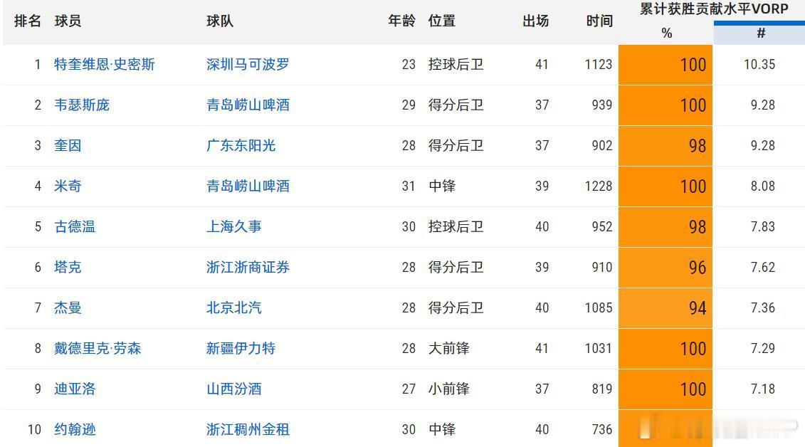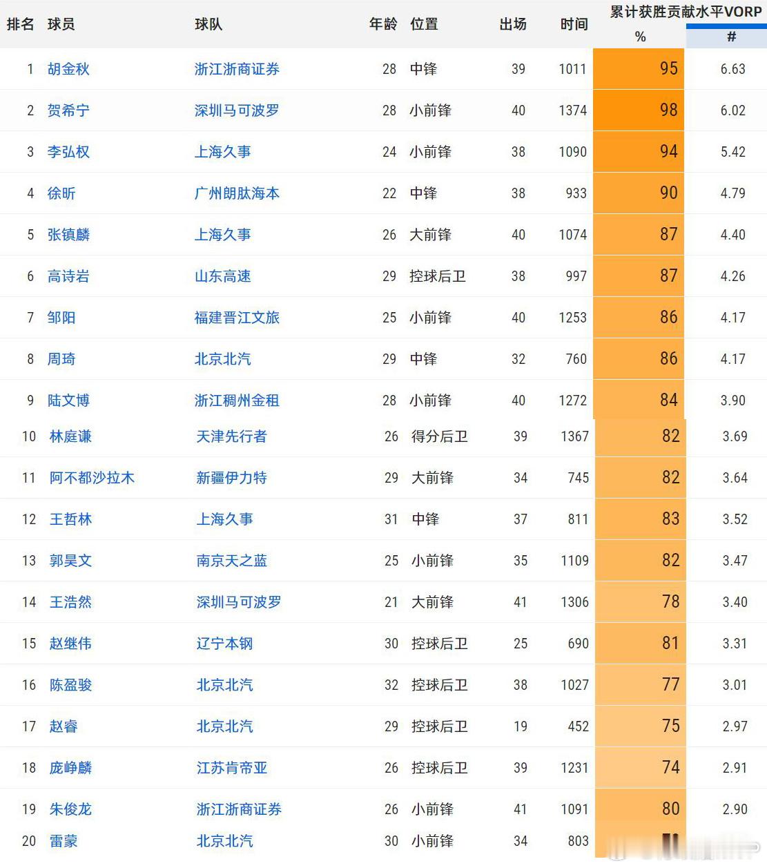 胡金秋的外援队友塔克的VORP值在所有球员中排名第6,而贺希宁的队友史密斯的VORP值在所有球员中则高居第一。另外,两人的本土队友王浩然和朱俊龙也分别位居本土VORP值榜单的第14和第19。从多个维度来对比,两人都各有千秋。