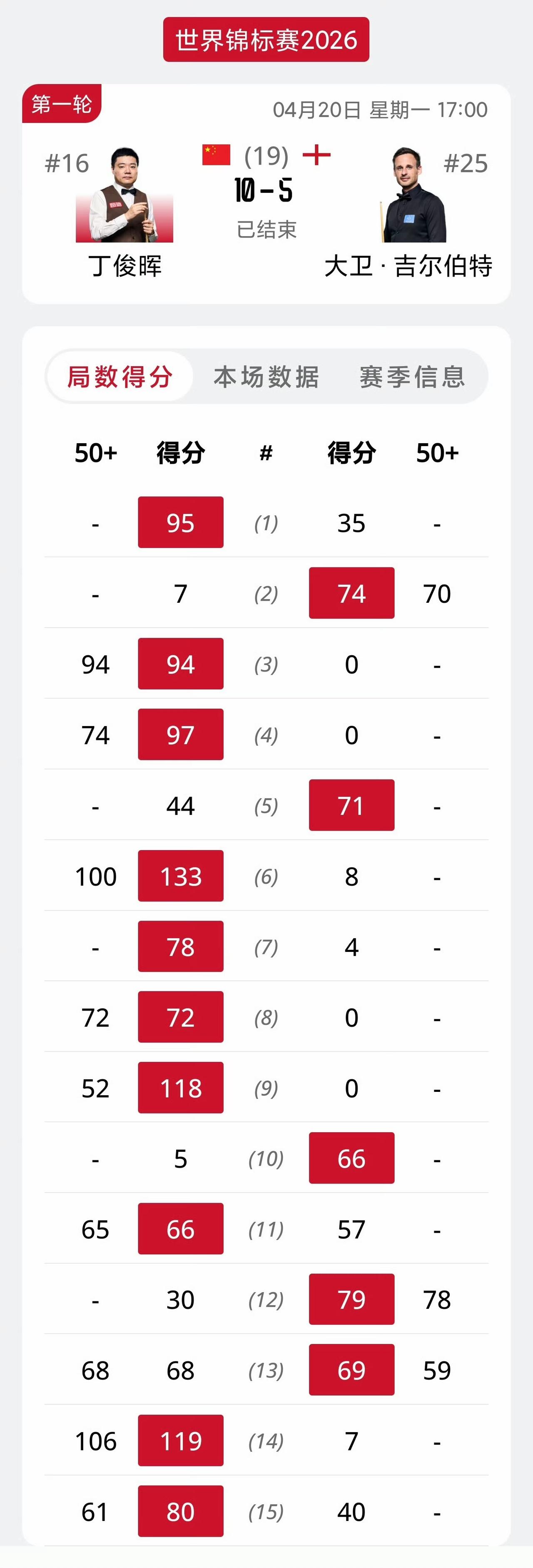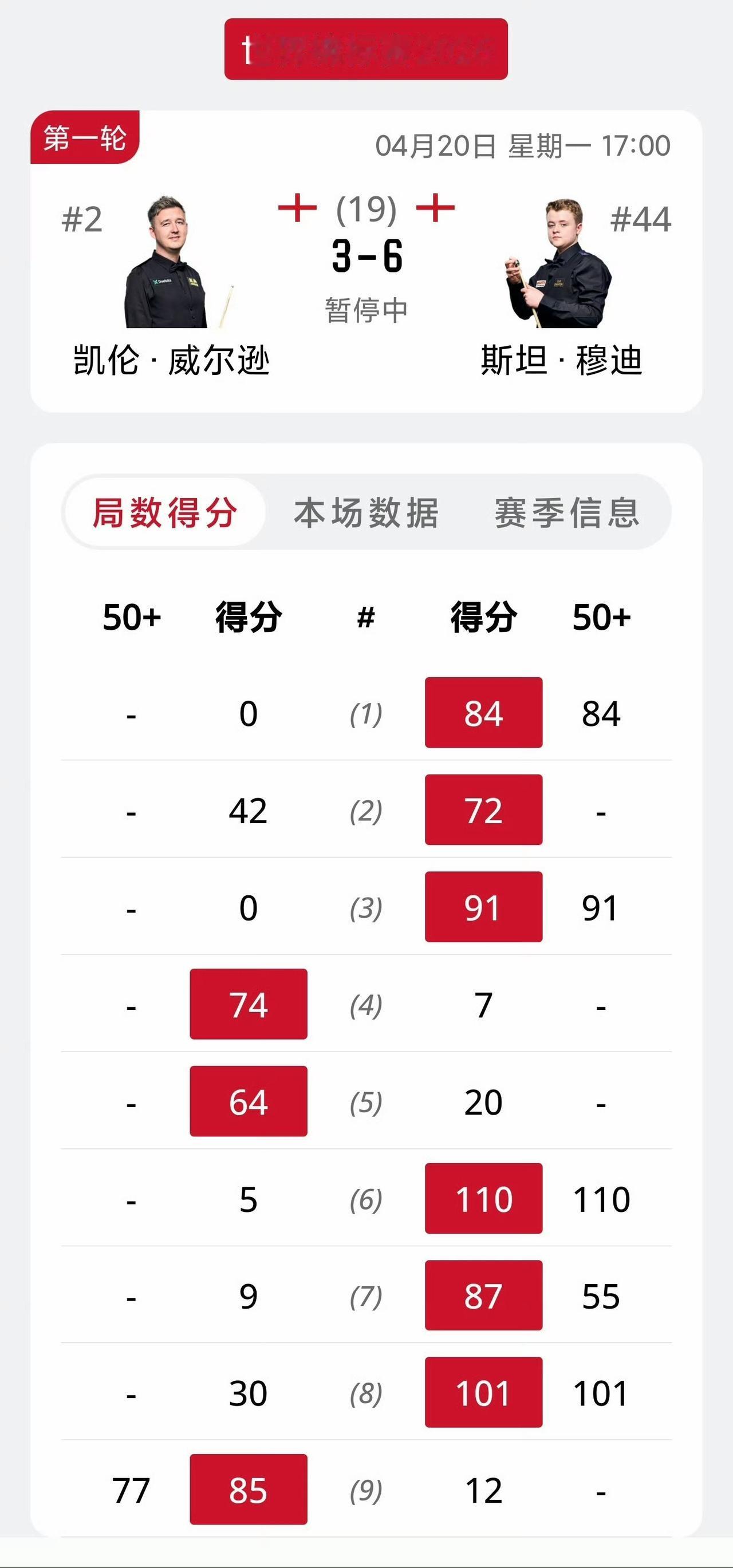 万众瞩目的丁赵会来了!面对丁赵会流量盛宴,世台联押对宝了。中国球迷又要面临抉择困难症了…… 希望赵心童打破克鲁斯堡魔咒,又希望丁主任打破世锦赛冠军荒。 丁俊晖10-5击败吉尔伯特晋级16强,首阶段丁俊晖7-2遥遥领先,第二阶段两人打成3-3,主任很容易就晋级了。 隔壁的欧洲神童已经打疯了,世界第二大概率要成为首位出局的种子球员,囧哥将连续两年首轮出局。 斯坦穆迪6-3凯伦威尔逊