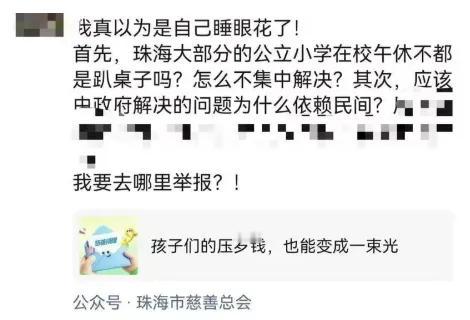 珠海这波操作,真把家长整不会了! 自家娃还在学校趴桌子午睡,转头就被学校通知捐压岁钱给乡村孩子买躺椅?珠海这位家长的朋友圈吐槽,直接捅了马蜂窝! 慈善总会本意是好的,帮乡村孩子改善午休条件。但问题出在哪?城区绝大多数孩子同样在趴睡啊!让一群自己都没躺平的孩子,先捐钱让别人躺平,这逻辑家长能接受吗?有孩子直接对家长说:“我也不想趴桌睡”,这话扎心了。 更深层的是慈善教育的尴尬。本想教孩子献爱心,结果可能适得其反!当公益脱离孩子真实感受,反而可能扼杀天生的善意。这不是反对帮扶乡村,而是公益项目设计不能制造苦难竞赛。 慈善的生命力在于公平,中小学生午休“躺睡”国标已实施,但现实是...空间有限,桌椅没到报废年限。当普遍需求都没解决时,任何优先帮扶都可能被解读为选择性忽视。 善意需要被呵护,但公平的底线更要守住。公益不是比谁更苦,而是让每个孩子都被看见。