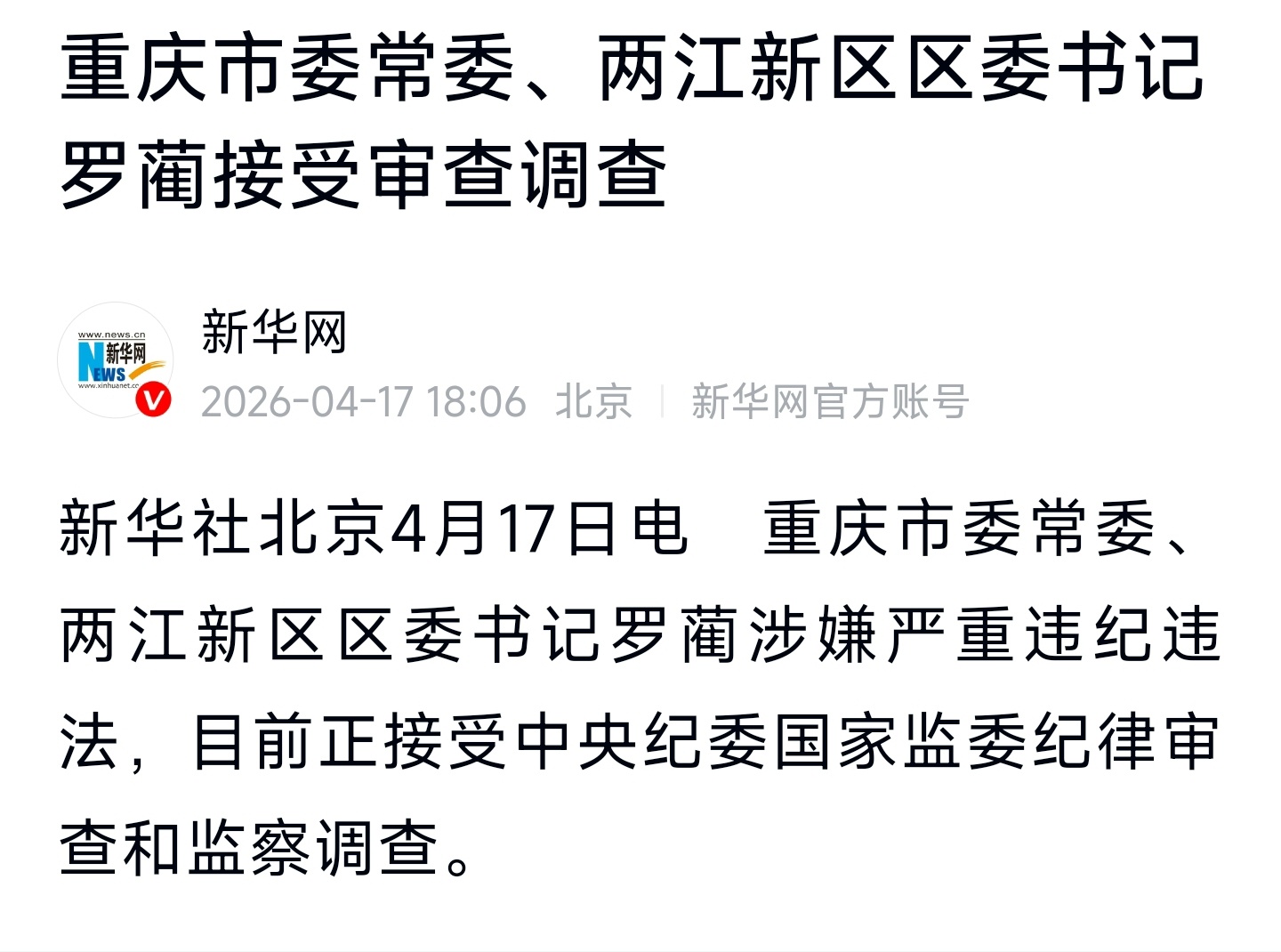 罗蔺涉嫌严重违纪违法罗蔺被查,两江新区历任党工委书记中,此前已有徐鸣、吴存荣、段