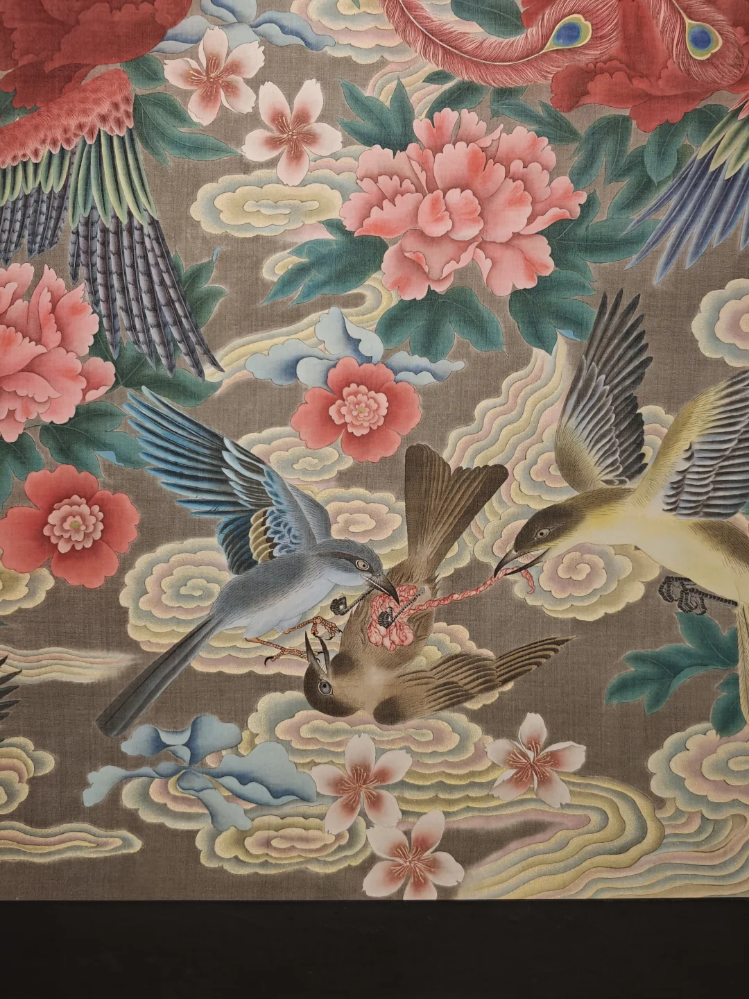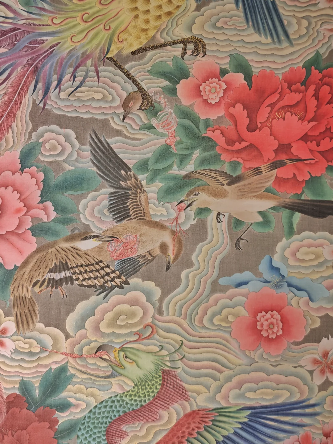 彩蛋:一副乍一看喜庆吉祥的《凤穿牡丹》题材大幅作品,仔细一看是血淋淋的弱肉强食,是强者上位,对传统的戏谑解构,果然充满艺术家自称的“高古朋克”精神。