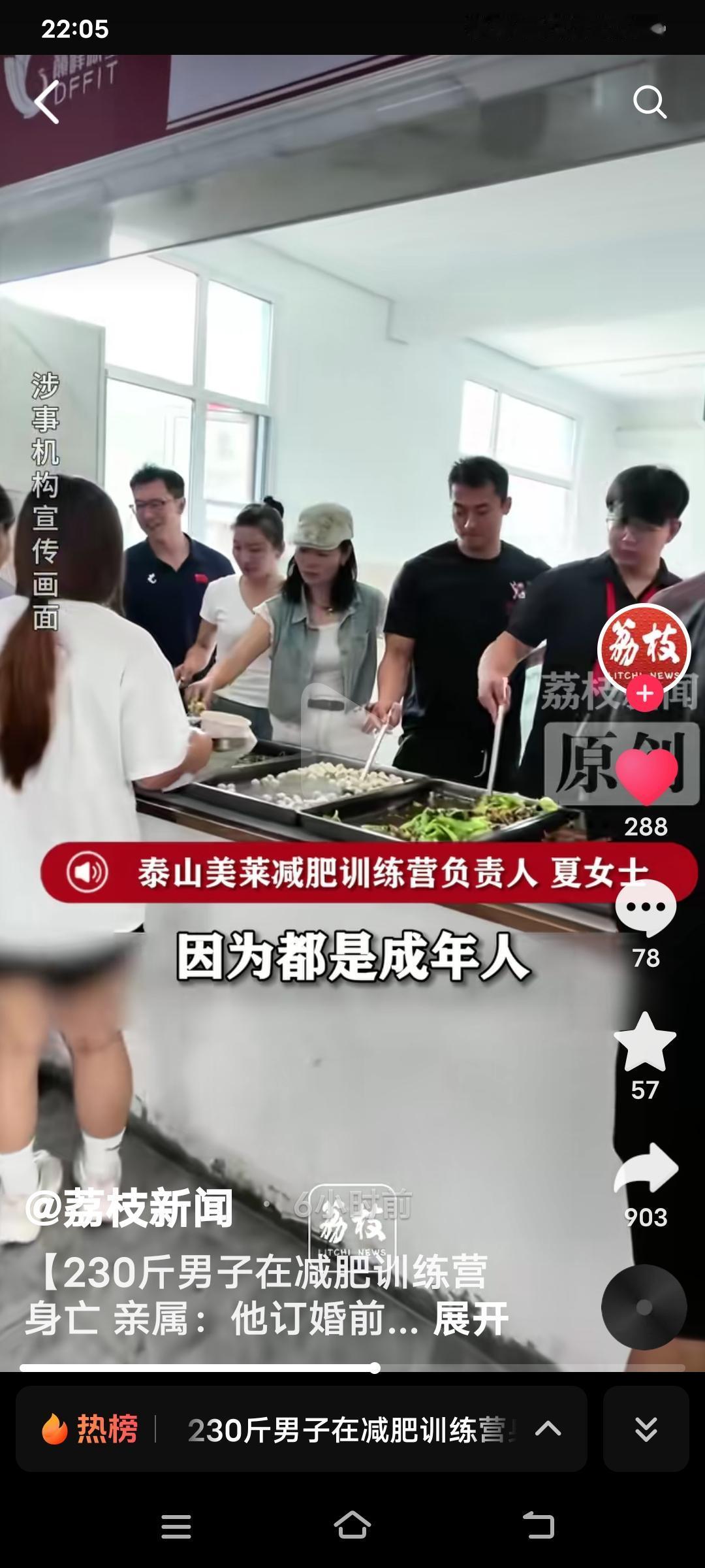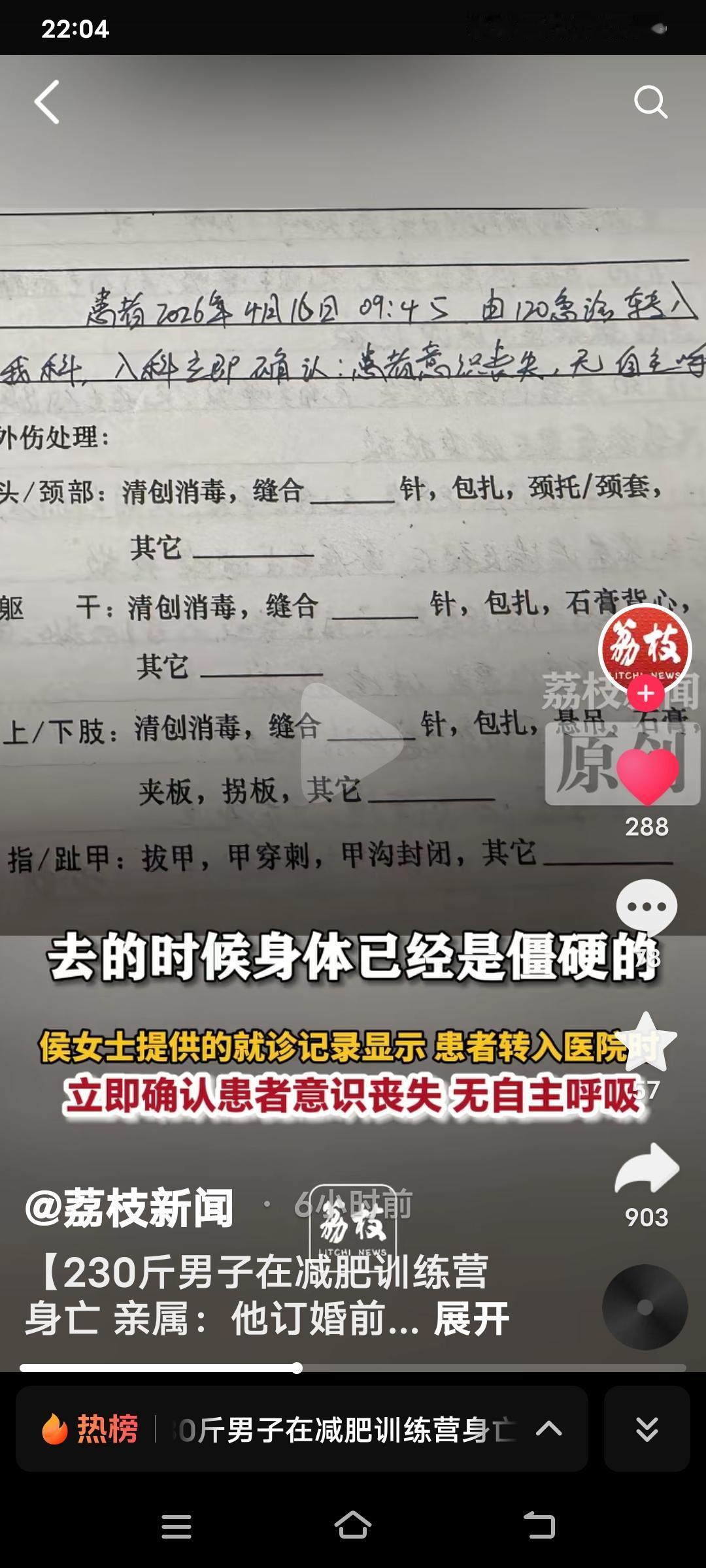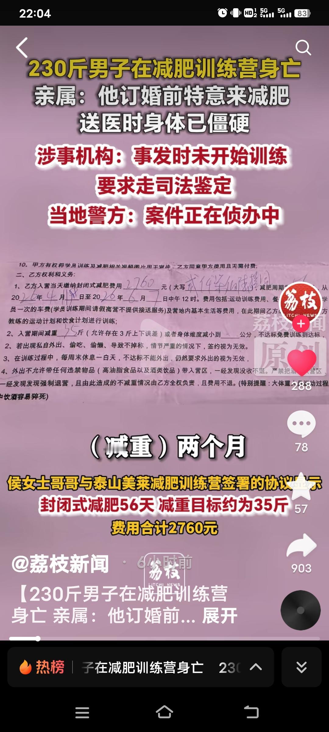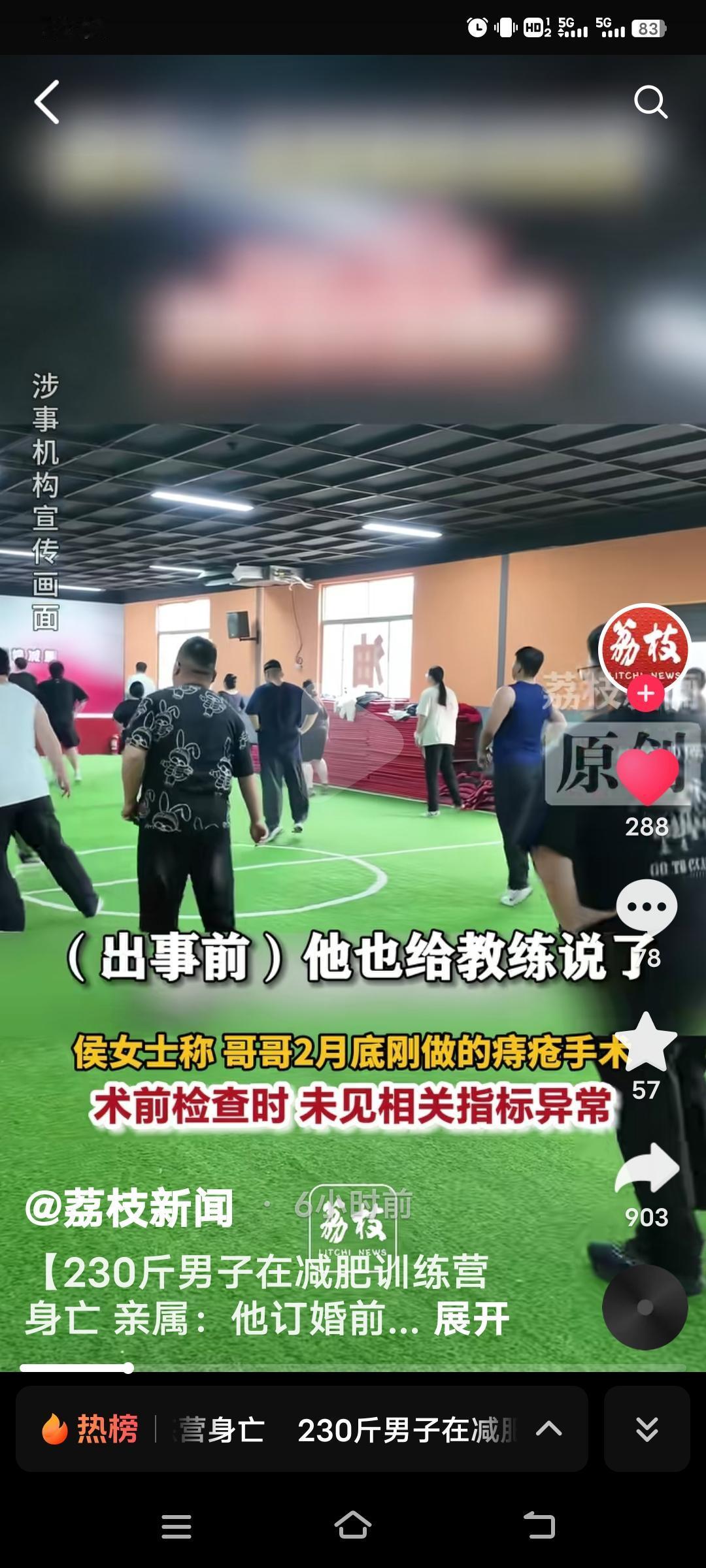 真是令人痛心!山东泰安体重230斤的侯先生,为了订婚特意去减肥,谁曾想入营仅3天就不幸身亡。从监控画面来看,房门敞开、灯光亮了一整晚,却无人巡查,家属质疑管理存在疏漏。 侯先生13号入营,16号就离世了。泰山美莱减肥训练营的负责人夏女士称,营里前三天是不安排训练的,毕竟都是成年人,大家都有各自的宿舍,也不会随意进入他人房间。 为了订婚,这肥减的可真不值呀!一条鲜活的生命就这样消逝了。据悉,他原本打算用56天减掉35斤。 谁能料到他这一去就再也没回来。事发前,他曾跟教练说身体不舒服。他的妹妹侯女士表示,送医时哥哥身体已经僵硬。侯女士还提到,哥哥2月份做过痔疮手术,术前检查身体并无异常。 有时候事情就是这么凑巧。平心而论,封闭式减肥本不该有危险,而且很多人都能顺利完成减肥,并无意外发生。如今出了这样的事,双方都很倒霉,侯先生失去了生命,减肥训练营也将面临经济损失。目前警方已介入,且看后续如何处理吧。