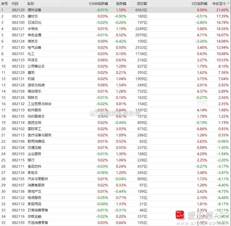 刚看了下今年各大板块的涨跌幅,排名第一硬件设备+21.6%,第二第三的半导体、有