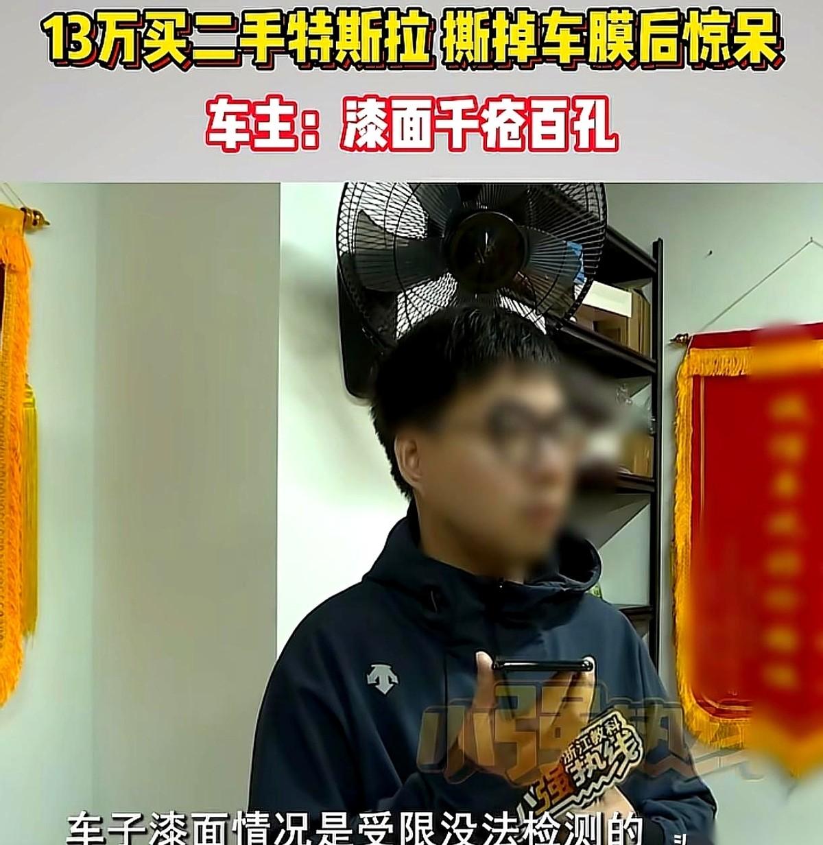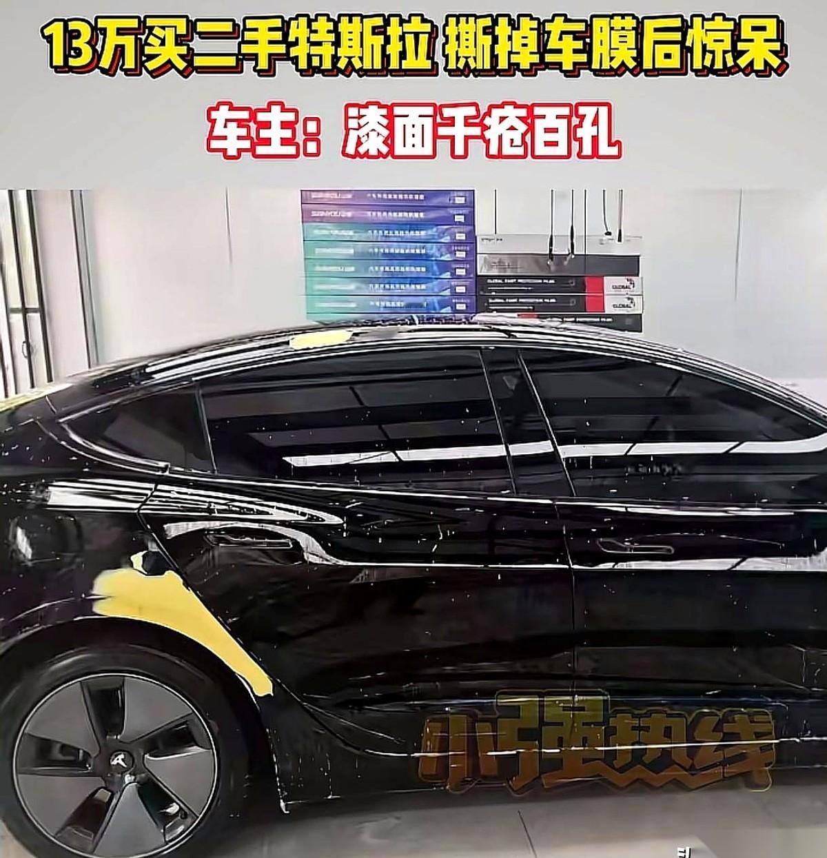 “呲啦——”贴膜店师傅手臂猛地一发力,最后一大块浅紫色的车衣被扯剥落地。站在一旁的施女士,捏着车钥匙的手瞬间僵在半空。 她那辆花了13万在杭州买的二手特斯拉,褪去这层漂亮的“紫衣”后,原漆表面居然爆出了十几个坑坑洼洼的黄色底斑!前保险杠、后车尾、连带脚踏底部的下边框,全是大片斑驳的烂漆,活像一张千疮百孔的“麻子脸”。 时间倒回三个月前,杭州某大型二手车展厅。施女士盯着这辆贴满紫膜的车,手里的检测报告白纸黑字盖着红章:“S级车况,几乎无损,局部修复”。 13万全款刚刷完,施女士指着车身提了个要求:“把这紫膜撕了,我要看原车底漆。” 几个销售立刻挡在车身前,连连摆手:“姐,里头油漆绝对是完美修复过的!咱们这么大的车城,不可能卖问题车!再说这改色膜是备过案的,现在一撕,您可就过不了户了!” 大厅明晃晃的白炽灯下,销售拍着胸脯打包票。施女士信了,拿着钥匙开走了这辆“蒙面车”。 如今,看着满地撕碎的废膜,修理厂的报价单直接拍在了施女士面前:这十几个面全得重新做漆,两万多块钱。 她立刻拿着照片找回车城要个说法。 这回,车城里的口风变了。工作人员从柜子里翻出当初的合同,手指重重地点在犄角旮旯的一行小字上:“全车外观贴膜改色,条件受限无法检测车辆漆面情况。” “车收来时就贴着膜,只能测有没有钣金换件,谁也不知道底下原漆长啥样。买卖合同上白纸黑字写了这情况测不了,您可是签了字的。”工作人员摊开双手。 施女士声音直接拔高了八度:“你们当时拍着胸脯说原漆修复得很完美!” 双方在大厅里僵持不下。直到媒体的镜头直接架到了二手车行的展厅里,这场拉锯战才有了转折。 面对曝光,车行负责人的态度终于软了下来,当着镜头的面拍板承诺:“修!这底漆我们按4S店的标准来重做,修漆的钱我们车行全掏。” 一场花了13万的购车交易,活生生变成了一局惊险的“拆盲盒”。买二手车碰上这种“带着浓妆相亲”的,真要是没去重新换膜,这层遮羞布还要盖多久?