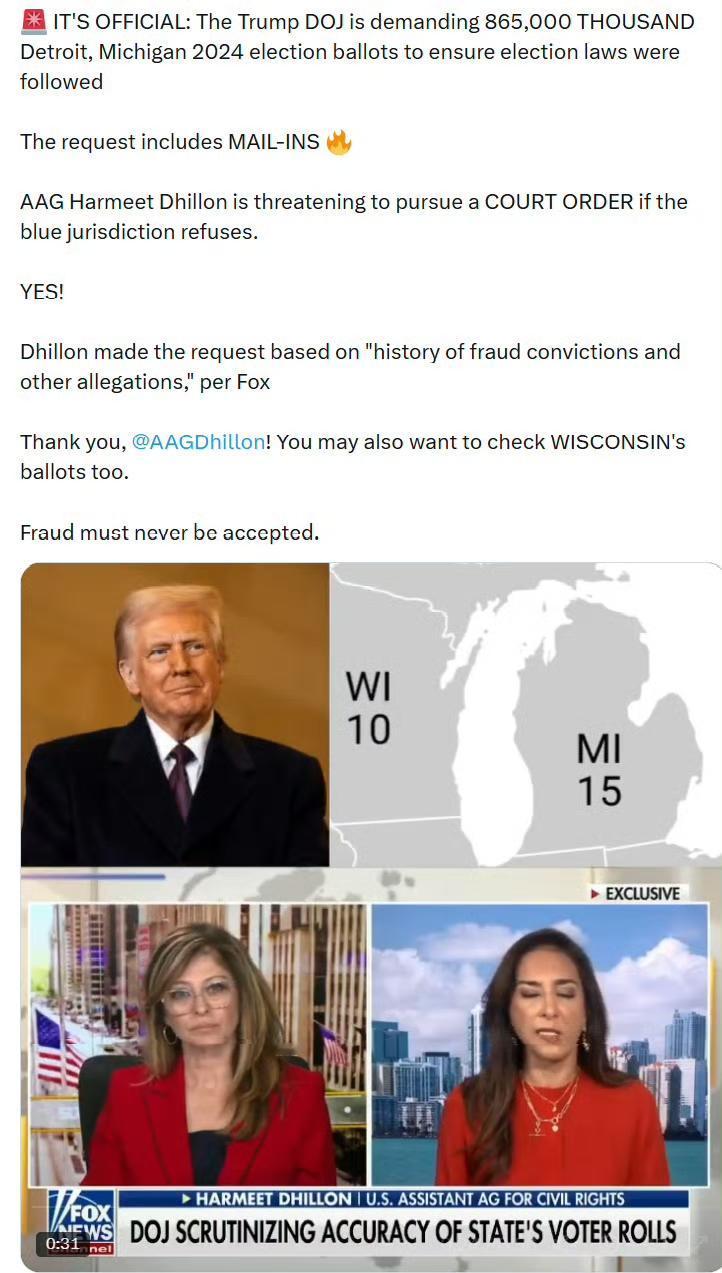美司法部正在要求调取密歇根州底特律市2024年选举的86.5万张选票,以确保选举法得到遵守。 此次要求包括邮寄选票 。 助理司法部长哈米特·迪隆警告称,如果这个民左党辖区拒绝配合,她将寻求法院强制令。 据福克斯新闻报道,迪隆此次要求是基于“以往的欺诈定罪记录和其他指控”。