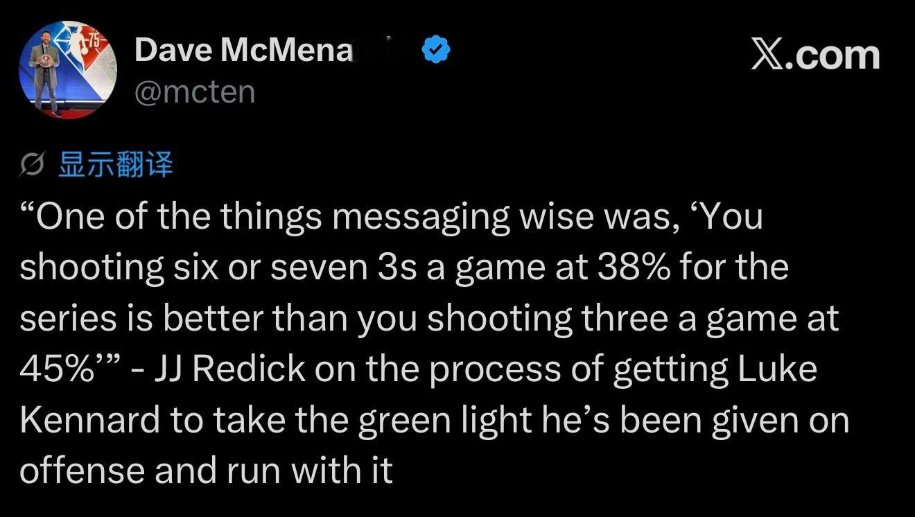 “我们在沟通中传达的一个信息是:‘系列赛里,你场均出手六到七个三分球、命中率38%,要比场均出手三个三分球、命中率45%更有价值。’”