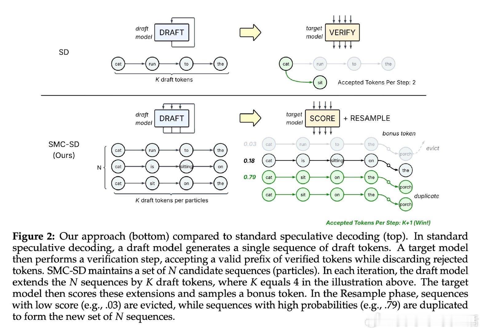 本文的核心洞见是:把"逐词验证"重新看作"粒子种群的重要性重采样"。由此,用连续权重替代二元接受/拒绝这一关键操作使问题得以解开——每个粒子不再被截断,而是按与目标分布的吻合度获得权重,低权重粒子被淘汰,高权重粒子被复制,固定数量的词元稳定输出。