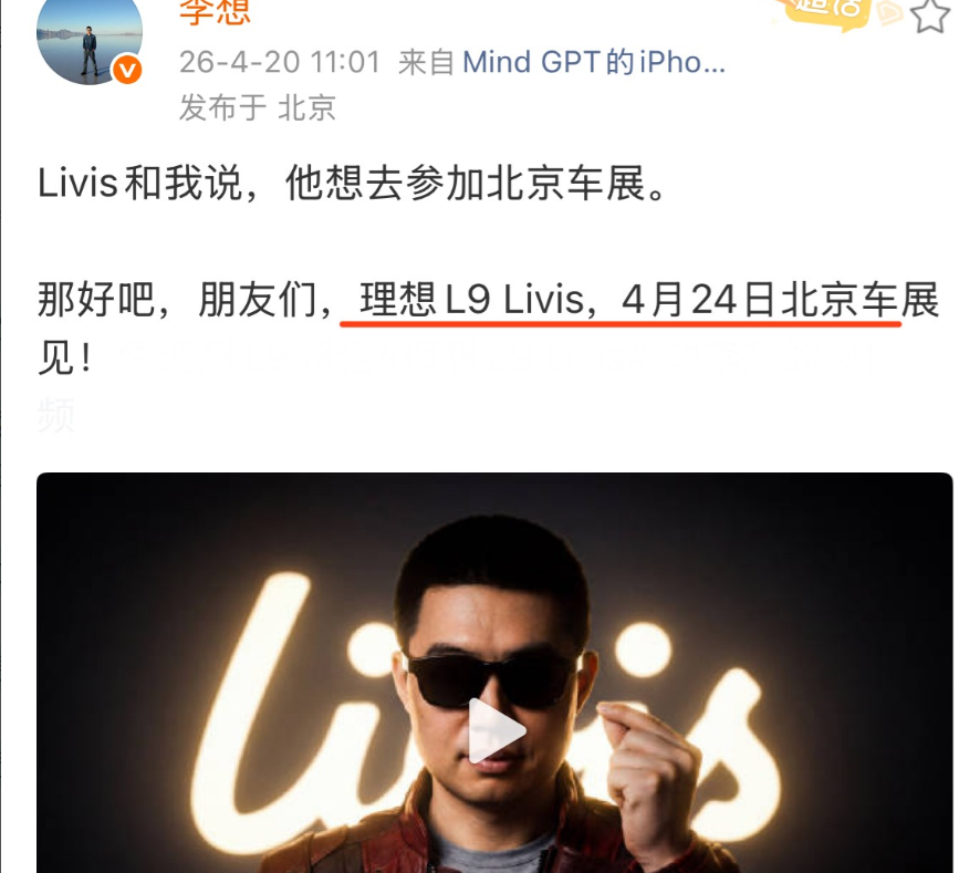 终于。 李想官宣,理想L9 Livis将在4月24日北京车展正式亮相。