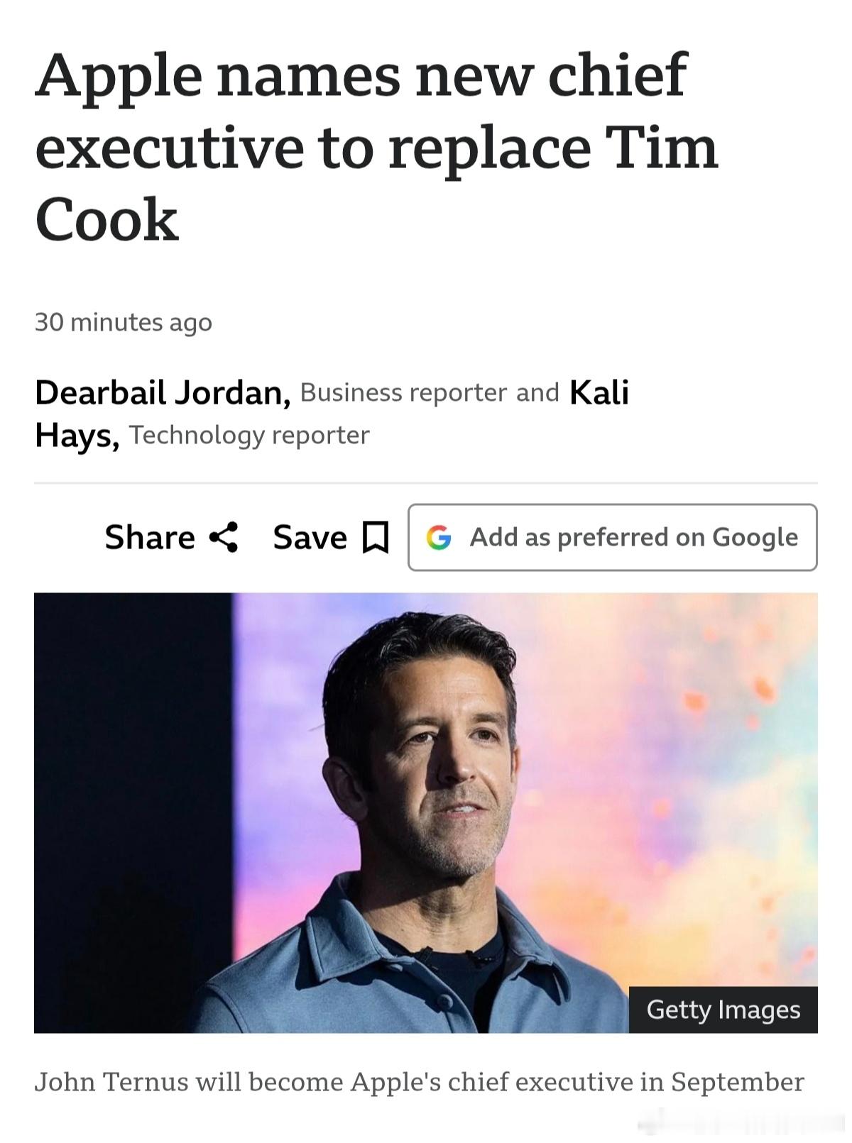 苹果公司宣布,蒂姆·库克(Tim Cook)将出任苹果公司董事会执行主席,硬件工程高级副总裁约翰·特纳斯(John Ternus)将于2026年9月1日接任苹果公司首席执行官。此次人事变动已获得董事会一致批准,是经过深思熟虑的长期继任计划后做出的决定。