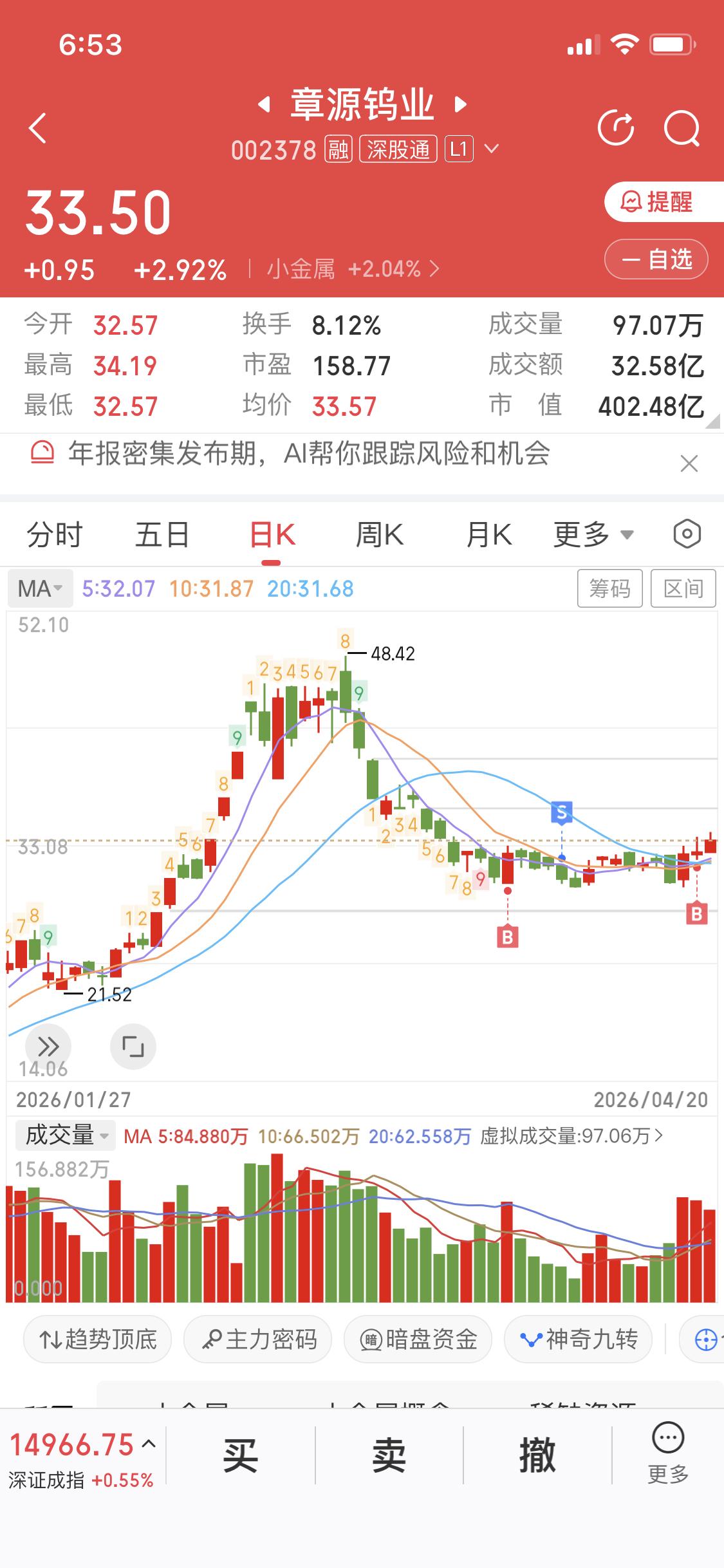 章源钨业最近成交量在放大 我最早3月27日买进去的 当天一根放量大阳线 后面四天阴跌洗盘 我走了 最近三天 章源成交量放大 红柱长度是之前的几倍 我又买回来了 主力准备拉升了 在车上就坐稳拿好