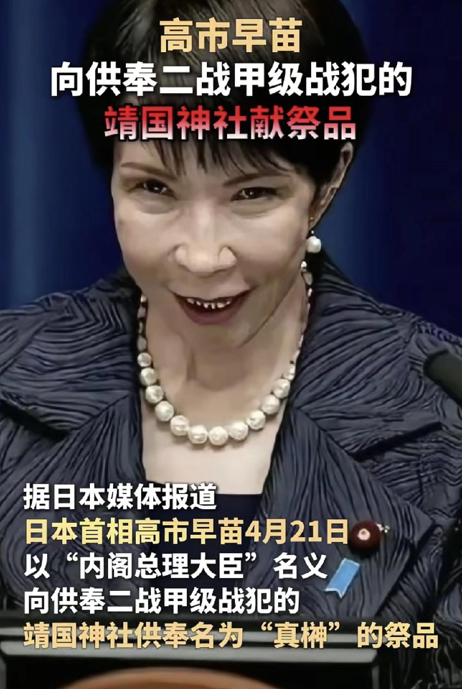 日本首相高市早苗,又在靖国神社问题上踩红线了! 日本首相高市早苗4月21日,以“内阁总理大臣”名义,向供奉二战甲级战犯的靖国神社供奉“真榊”祭品。 靖国神社里供奉着双手沾满亚洲受害国人民鲜血的甲级战犯,是日本军国主义的象征。高市早苗的这一举动,本质上是对侵略历史的公然美化,更是对亚洲受害国人民感情的严重践踏。 历史不容篡改,正义不容挑战。日本政要一次次在靖国神社问题上挑衅,只会让周边国家看清其拒绝反省侵略历史的真实面目。任何美化侵略、否认罪责的行为,都只会遭到国际社会的强烈反对,也终将成为日本与亚洲邻国和解路上的绊脚石。忘记历史,就意味着背叛;否认罪责,就是重蹈覆辙!
