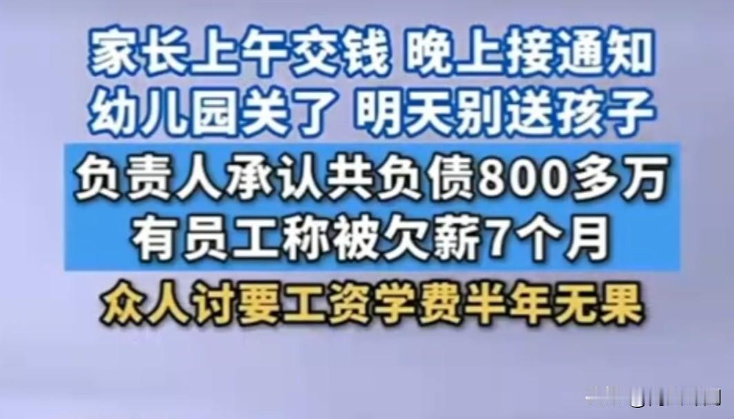 太坑了!幼儿园上午收钱晚上闭园,负债800万,家长老师维权半年没结果 去年11月,海南陵水某幼儿园突然通知闭园,把家长和老师都坑惨了。有家长说,上午刚把学费交了,晚上就接到通知:幼儿园关了,别送孩子来了。更气人的是,通知还是教育局转达的,园方从头到尾没说一句话。 调查结果出来,负责人承认一共负债800多万。老师更惨,被欠薪7个月,社保也断了。从闭园到现在快半年,家长天天追着要学费,老师天天讨工资,至今一点说法都没有 。 这哪是经营不善,分明是把家长和老师当“冤大头”! 闭园前还在疯狂收费,甚至用“交三年返利息”的套路骗大家预缴 。收完钱就跑路,负债认账但一分不还,太没底线 。 孩子是家庭的希望,幼儿园本该最讲良心。现在倒好,变成了圈钱的坑。老师辛苦干活拿不到钱,家长血汗钱打了水漂,太让人心寒。 希望有关部门能硬起来,尽快给大家一个交代,别让老实人一直吃亏!