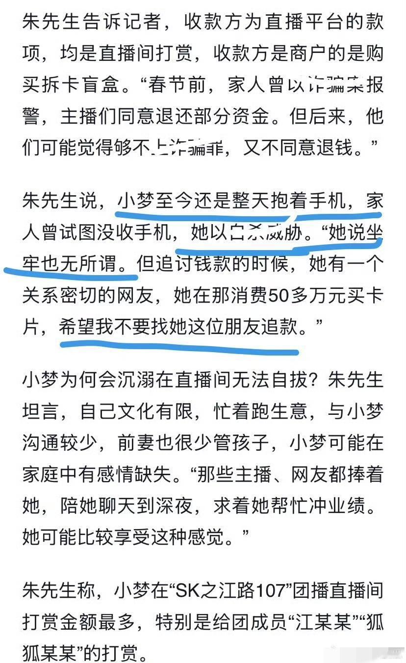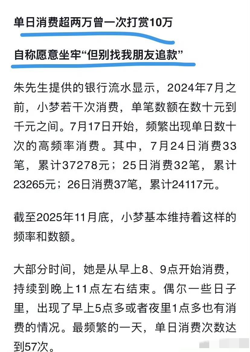 真疯了!19岁女孩挪1700万当"榜一大姐",亲爹含泪送自首:出来都30多了! 家人们,最近这新闻看傻眼了!河南郑州19岁女孩小梦,在自家冷链档口做出纳,愣是把老爸半辈子攒下的1700万身家,全砸进直播间当"榜一大姐" ! 老爸朱先生无奈到极点,只能带女儿去自首 。一边是亲闺女,一旦判刑至少十年,出来都30多岁,人生全毁;一边是1700万全家活命钱,还欠着债主几百万,不报案定性赃款,半毛钱都要不回 。当爹的太难了,换谁能不纠结? 小梦中专读一年就辍学,19岁掌管家里大钱,从2024年7月开始疯狂刷钱。1100万打赏主播,600万买拆卡盲盒,单笔最高刷10万,一天最多消费57笔,从早8点刷到凌晨,多个直播间稳坐"榜一"。主播一口一个"老婆""宝宝",天天陪聊哄着,把这孩子迷得神魂颠倒。 如今老爸30年家业彻底破产,负债数百万,小梦还天天抱着手机,甚至说"坐牢无所谓,别找主播追款就行"。找主播退款全被拒,MCN甩锅平台,平台只说配合调查,追款难上加难 。 这哪是打赏,分明是被虚拟世界套牢!父母离异缺陪伴,平台风控全失效,主播诱导不停手,三重失守毁了一个家。 年轻人醒醒吧!直播间的甜言蜜语全是生意,真在乎你的人不会让你砸光家底。家长们也别大意,金钱管得再严,不如多给孩子点关心。平台更该负起责,别让悲剧再重演! 大家说这钱能追回来吗?主播该不该退?19岁毁了一生,值不值?评论区聊聊! 19岁女孩挪用1700万当榜一大姐 直播打赏乱象 家庭教育