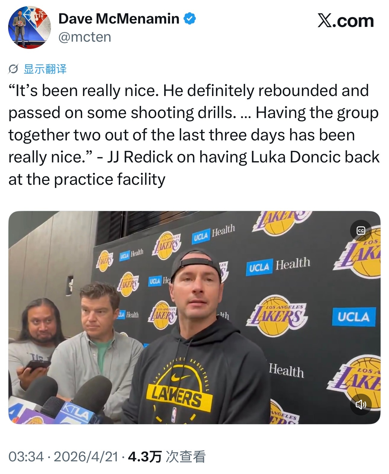 雷迪克谈东契奇回归训练馆: