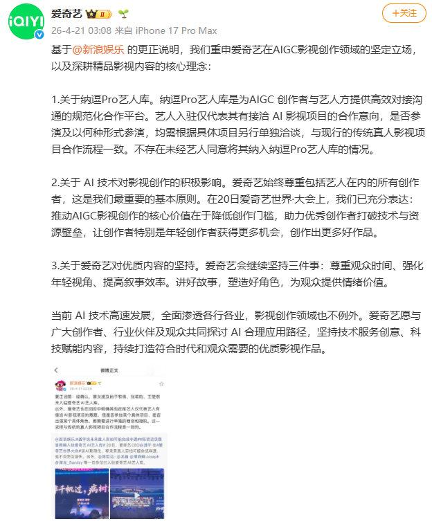 【爱奇艺称尊重艺人在内的所有创作者爱奇艺凌晨紧急发声】4月21日凌晨,有媒体发布更正说明,称于和伟、张若昀、王楚然未入驻爱奇艺AI艺人库。爱奇艺转发相关内容并表示,不存在未经艺人同意将其纳入纳逗Pro艺人库的情况。爱奇艺重申,纳逗Pro艺人库是为AIGC创作者与艺人方提供高效对接沟通的规范化合作平台。艺人入驻仅代表其有接洽AI影视项目的合作意向,是否参演及以何种形式参演,均需根据具体项目另行单独洽谈,与现行的传统真人影视项目合作流程一致。