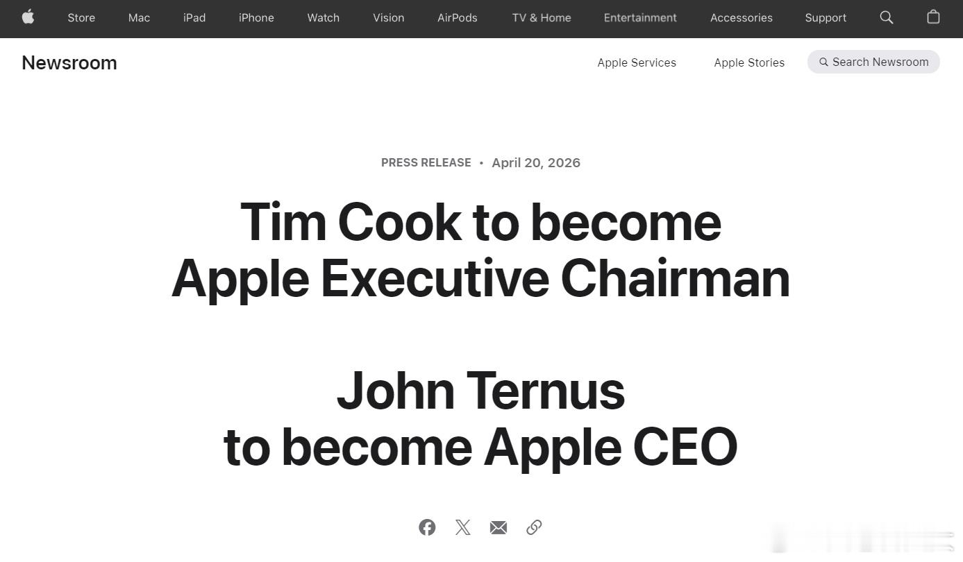 今天在意料之外是因为事发突然,库克发长文宣布9月1日辞任苹果CEO,改任执行董事长了,苹果现任硬件工程高级副总裁John Ternus将接任CEO,苹果芯片之父、原硬件技术高级副总裁Johny Srouji将接替John Ternus,出任首席硬件官。