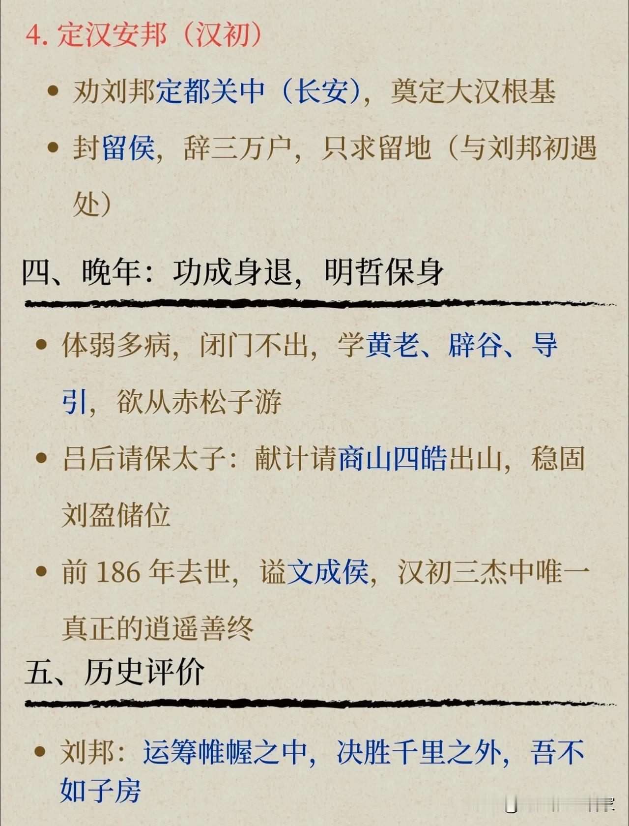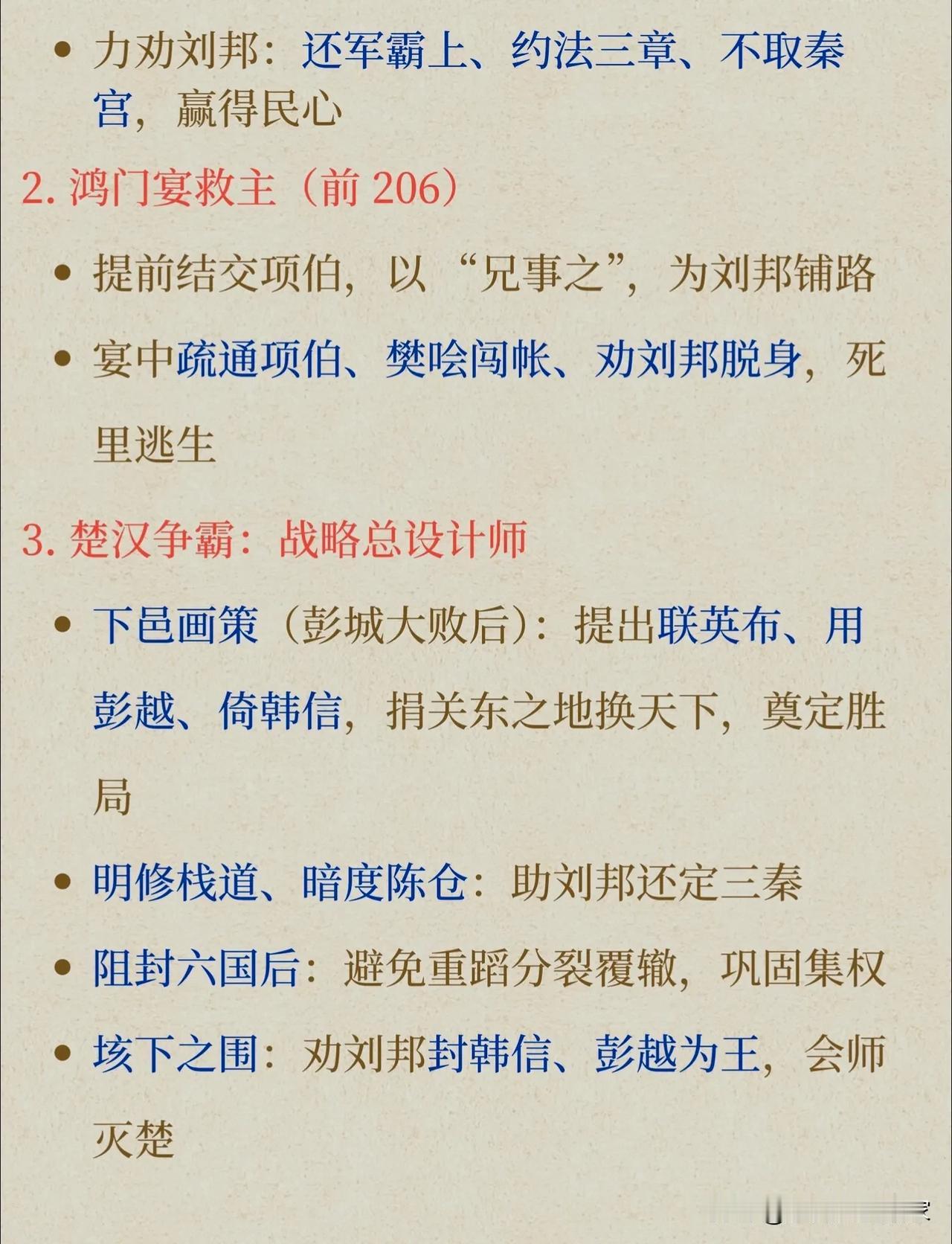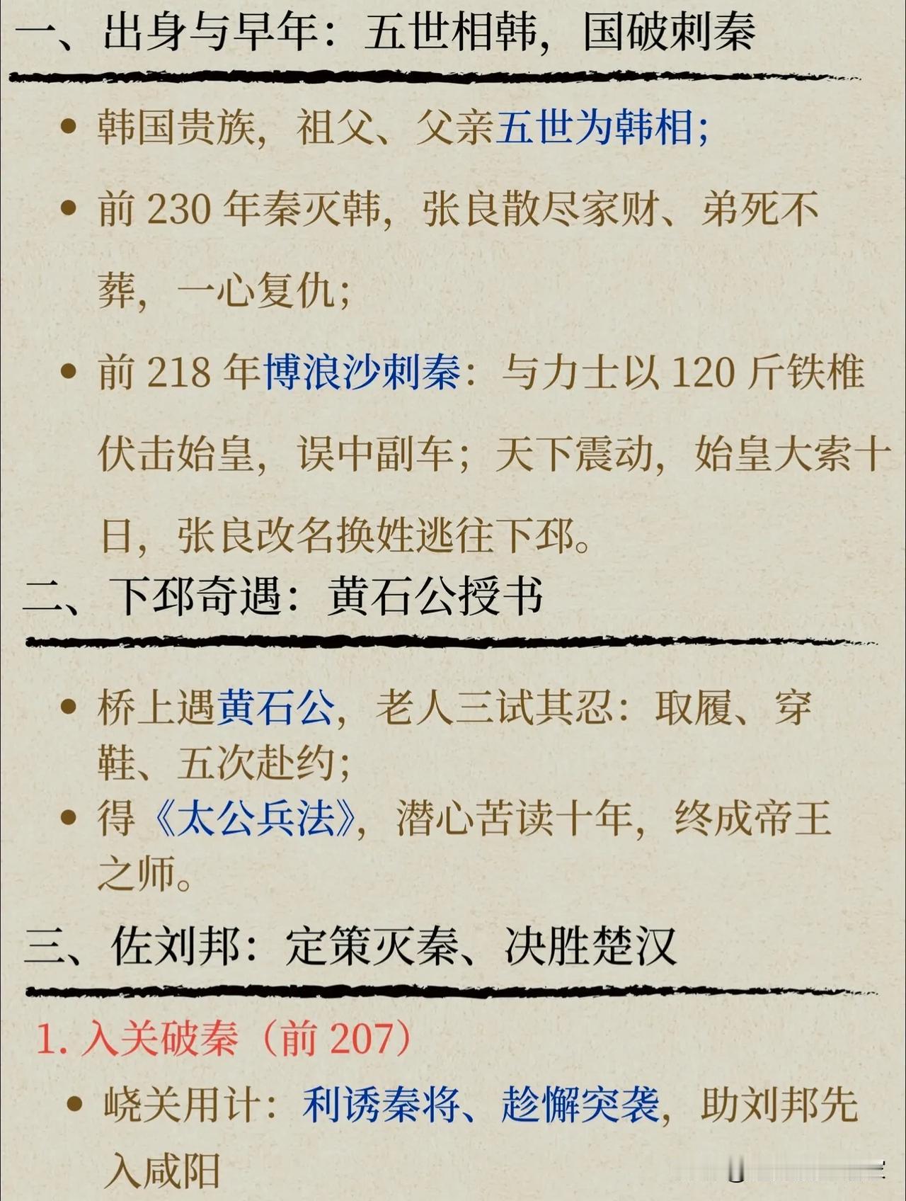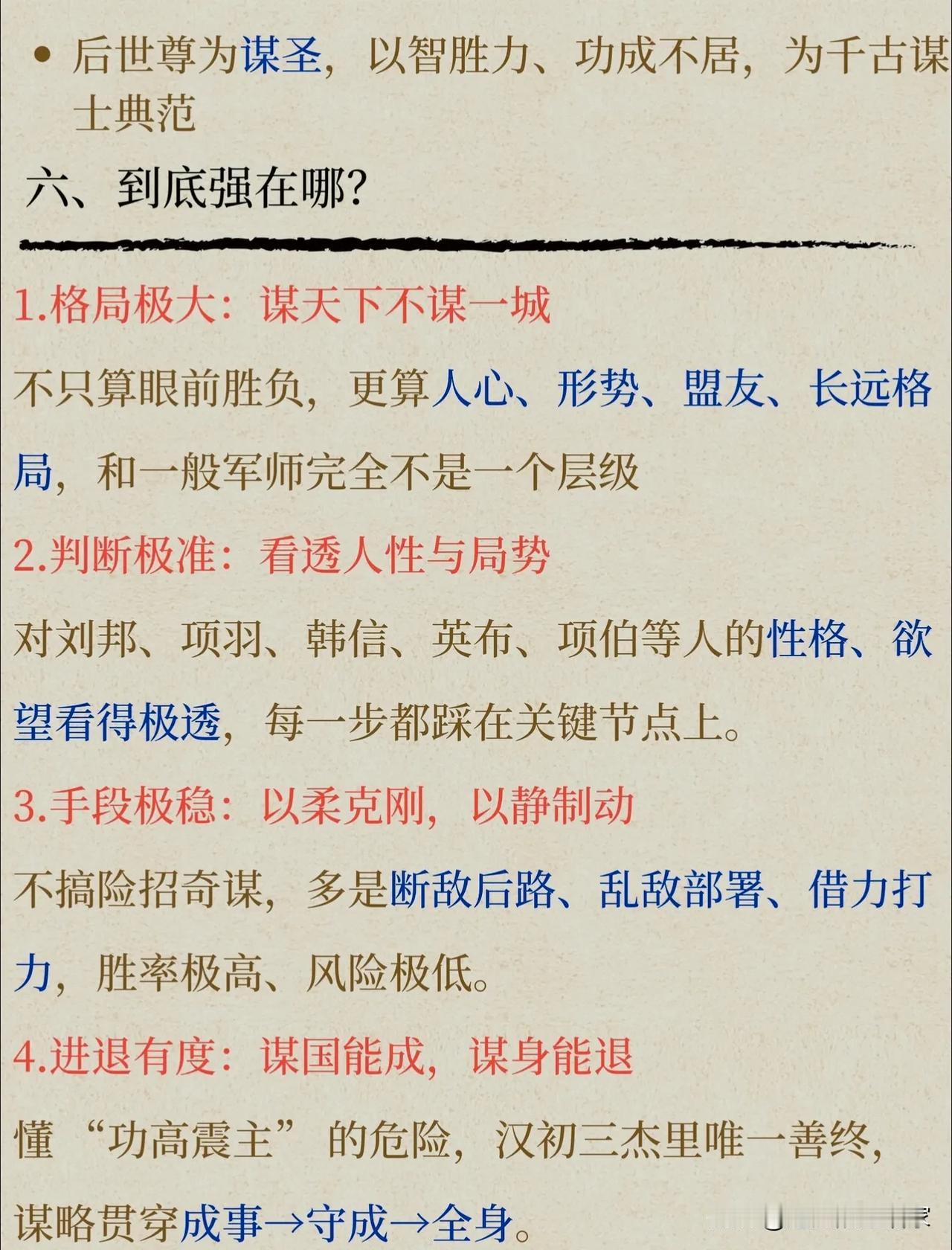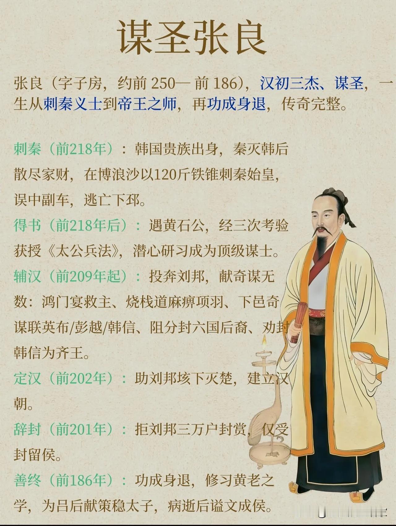 张良:从刺秦亡命徒到谋圣,他的一生,是所有谋士的终极理想! 提到张良,很多人只知道他是“汉初三杰”里最会保命的那个,却很少有人读懂他藏在“功成身退”背后的顶级智慧。他的一生,从刺秦的热血少年,到定天下的帝王之师,再到全身而退的隐世高人,活成了中国历史上最完美的谋士范本。 一、开局即巅峰:从国破家亡,到博浪沙刺秦 张良的起点,比大多数人都高——祖父、父亲五世为韩相,是妥妥的韩国顶级贵族。但秦灭六国,韩国灭亡,他一夜之间从贵公子变成了亡国之人。 弟弟死了都顾不上安葬,散尽家财只为复仇,在博浪沙用120斤的铁锥伏击秦始皇,哪怕误中副车,也让天下震动。 这时候的张良,还不是那个运筹帷幄的“谋圣”,只是个带着一腔孤勇的复仇者。而改变他一生的,是下邳桥上,黄石公的三次考验。 三次取履、五次赴约,磨掉了他的戾气,也磨出了他的隐忍。十年苦读《太公兵法》,曾经的热血少年,终于变成了能谋天下的顶级谋士。 二、谋定天下:刘邦的“隐形大脑”,每一步都踩在关键节点上 刘邦能赢项羽,一半靠韩信的兵,一半靠萧何的粮,而剩下的一半,全靠张良的脑子。他的谋略,从来不是险招,而是算透人心、算透局势的阳谋: - 鸿门宴救主:提前结交项伯,宴中疏通关系、樊哙闯帐,硬生生把刘邦从鬼门关拉了回来,这不是运气,是对人性的精准拿捏。 - 下邑画策定大局:彭城大败后,刘邦几乎崩盘,张良一句话定下了联英布、用彭越、倚韩信的铁三角,直接给楚汉争霸画好了胜利路线。 - 阻封六国后裔:刘邦一时糊涂想复立六国,张良当场反对,直接点破“分封就是重蹈战国分裂覆辙”,保住了大汉的统一根基。 - 劝封韩信为齐王:垓下之战前,刘邦和韩信闹僵,张良劝他封韩信为王,换来了大军会师,最终一举灭楚。 刘邦说他“运筹帷幄之中,决胜千里之外”,一点都不夸张。别人算一城一池的得失,他算的是天下大势、人心向背,这才是顶级谋士和普通军师的差距。 三、功成身退:汉初三杰里,唯一真正活明白的人 汉朝建立,论功行赏,刘邦让他“自择齐三万户”,这是多大的恩宠?但张良直接拒绝了,只要求封了个小小的留侯,还是他和刘邦初遇的地方。 后来更是闭门不出,学黄老、辟谷,甚至连吕后请他保太子,他也只出了个“请商山四皓出山”的点子,点到为止,绝不卷入朝堂纷争。 反观萧何,自污名节才勉强保命;韩信,功高震主,最终被夷灭三族。只有张良,在功成名就之后,完美落地,得以善终。 很多人说他是“胆小避祸”,但我觉得,他比谁都看得透:刘邦要的不是一个一直掌权的谋士,而是一个懂得“功成不居”的臣子。他用主动退出,换来了自己和家族的平安,也守住了自己的初心。 💡 张良的“谋圣”之道,藏着4个普通人也能用的智慧 1. 谋事先谋局,谋局先谋心 他所有的计策,都不是靠奇技淫巧,而是靠看透人心。对刘邦的多疑、项羽的自大、韩信的野心,他都了如指掌,每一步都踩在人性的弱点上。 2. 以柔克刚,用最低的风险拿最高的胜率 他从不赌命,鸿门宴不硬刚,分封时不贪功,总是用最稳妥的方式解决问题。比起破釜沉舟的勇气,这种“以静制动”的沉稳,才是真正的顶级能力。 3. 格局越大,越懂取舍 拒绝三万户的封赏,不是傻,是他知道“月满则亏”的道理。比起眼前的荣华富贵,他更看重长久的平安和身后的名声。 4. 进退有度,成事不居功 很多人败在“功高震主”,就是因为不懂“退”。张良的厉害,不仅在于能帮刘邦打天下,更在于能在功成名就之后,优雅地转身离开。 张良的一生,从复仇者到帝王师,再到隐世高人,把“谋”字玩到了极致。他谋过天下,也谋过自己,最终活成了中国历史上,唯一一个“谋国能成,谋身能退”的完美范本。 你觉得张良最厉害的,是他的谋略,还是他的智慧?评论区聊聊~ 历史人物 张良 汉初三杰 谋圣