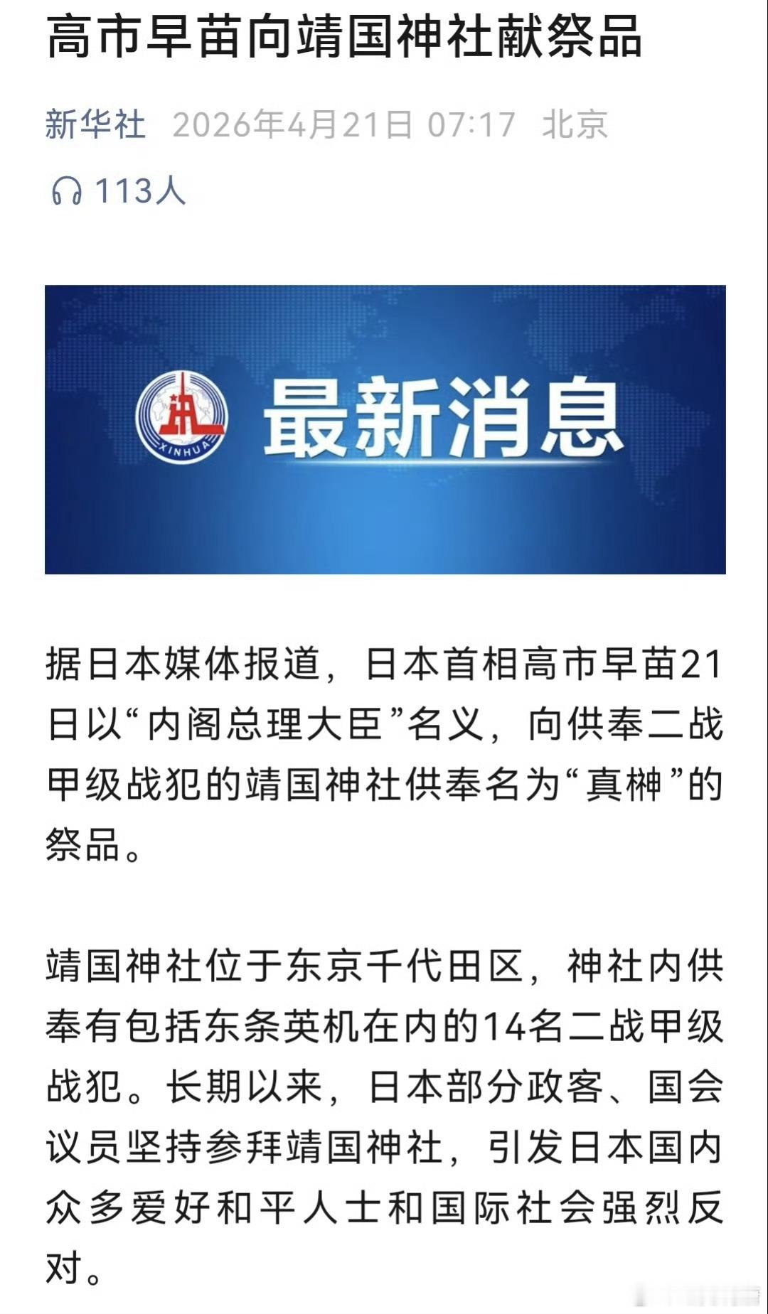 高市早苗向靖国神社供奉祭品记得前两天还看到个热搜,说高市早苗暂缓拜厕,我有时候真的怀疑一些人就是刻意给日本降温,实际上对面已经越过底线N次了,你但凡对日本这群东西有一丁点幻想,都会遭受实实在在的损失。