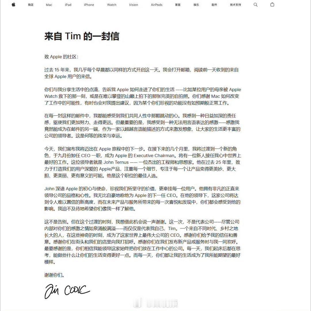 库克执掌苹果15年,将公司市值推向4万亿美元高峰,其“全球打工皇帝”的任期已属漫长。此时交棒是明智之举,长期占据一把手位置易形成路径依赖,阻碍组织活力与战略革新。特纳斯作为硬件负责人接任,标志着苹果回归产品驱动逻辑。库克在巅峰期主动退居二线,既完成了从乔布斯继承者到伟大守成者的历史使命,也为苹果下一轮创新留出了空间,这种急流勇退的交接值得企业界借鉴。