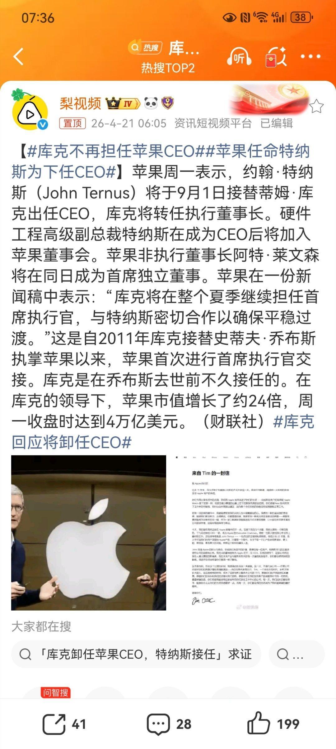 【库克不再担任苹果CEO苹果任命特纳斯为下任CEO】苹果公司于4月20日宣布,现任CEO蒂姆·库克将于今年9月1日卸任,转任董事会执行主席。接替他的是公司硬件工程高级副总裁约翰·特纳斯(John Ternus),他将成为苹果新任CEO并加入董事会。库克自2011年接替乔布斯以来已执掌公司15年,任内公司市值增长约24倍,达到约4万亿美元。库克回应将卸任CEO