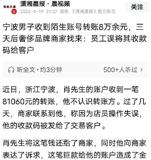 浙江宁波,男子收到一笔陌生转账81050元,他怕出事立马去报警,警方:这笔钱可能给他账户带来金融安全风险,在查清之前让他先别用账户。男子等了3天,一商家出现,态度不礼貌,催促男子去派出所还钱,男子忍着气,在民警见证下将钱转给店长私人账户,事后,男子认为自己的收款码被随意留存泄露,希望商家弥补,只简单道歉就完事了吗?可对方态度令他失望。 4月5日下午,浙江宁波的肖先生正在户外处理个人事务,手机突然响起,来电显示为陌生号码。 接通后,宁波阪急商场CELINE门店工作人员的声音传来,语气生硬无丝毫客气,没有任何开场白,直接要求肖先生当天必须赶到辖区派出所,退还81050元转账。 通话中,对方不仅未道一句歉,还多次不耐烦催促,甚至带着指责语气,仿佛肖先生拖延退款是故意为之。 这场催促的根源,要追溯到三天前的4月2日。 当天下午两点左右,肖先生在家休息时,手机弹出支付软件转账提醒,81050元的进账让他瞬间慌神。 他仔细核对后发现,这笔钱既不是公司工资,也不是网购退款,付款方完全陌生,备注栏也无任何资金来源说明,不安感愈发强烈。 不同于常人面对“天降横财”的窃喜,肖先生结合近期反诈宣传,担心这笔不明大额资金可能涉及电信诈骗、洗钱等违法活动,一旦动用,可能导致账户冻结、被牵连涉案,难以自证清白。 出于谨慎,他当天便携带手机赶往派出所主动备案,将转账时间、金额、付款方信息及自身疑惑,详细告知值班民警。 民警结合过往案例,严肃提醒肖先生:此类大额不明转账存在极高金融风险,可能涉及洗钱、电诈资金流转或商家操作失误,查清资金来源前,需暂停使用该收款账户,不进行任何转账收款操作,等待转账方联系,并为其做好备案记录,告知其及时提供相关线索。 遵照民警提醒,肖先生的日常生活被彻底打乱。习惯扫码支付的他,不得不提前取现金随身携带,买菜、购物都需现金付款,多次出现现金不足、找零麻烦的情况。 他不敢用该账户收发款项,甚至查看余额都格外谨慎,三天里始终忐忑不安,期盼转账方能尽快出现,让生活恢复正常。 4月5日接到CELINE门店电话时,肖先生距离派出所较远,无法立即赶到,便耐心解释处境,说明会尽快配合退款。 可对方不仅不理解,反而在电话中指责他故意拖延、不配合,语气愈发严厉,仿佛错在肖先生。 尽管满心不满,肖先生清楚钱款并非自己合法所得,还是答应尽快赶往派出所。 挂掉电话后,肖先生回忆起与该门店的交集:此前他曾在该门店订购一件奢侈品,后因款式不合心意退货,为方便退款,将个人收款码发给店长,明确告知仅用于此次退款,没想到商家私自留存,还被店员误当作门店收款码发给客户,导致货款错转。 随后,肖先生立即打车赶往派出所,在民警全程见证记录下,核对门店提供的误转证明、客户付款记录后,将81060元(门店核对细微误差)全额转到店长私人账户。 退款后,肖先生心中的石头落了地,却生出疑问:个人收款码关联支付账户,属隐私信息,商家为何未经同意私自留存、滥用? 心中委屈难以排解,肖先生将经历分享到社交平台,附上转账记录、通话录音和备案回执,此事迅速发酵,引发全网关注,网友纷纷替他打抱不平。 迫于舆论压力,CELINE门店主动联系肖先生道歉,称已永久删除其收款码、处分涉事店员,却未说明具体处分结果。 这份道歉格外敷衍,门店仅通过电话和简短邮件表达歉意,未出具书面说明,未解释留存收款码的原因,也未说明支付信息是否彻底清除、是否存在泄露和再次误用风险,肖先生多次询问细节,均未得到明确答复。 肖先生希望商家弥补自己三天来的不便——支付账户停用导致出行购物不便,多次往返派出所耽误时间精力、产生交通费用,但商家未提及任何补偿。 宁波阪急商场也仅发布简短声明,称会督促门店整改、加强员工培训,未对肖先生诉求给出具体答复,也未说明整改措施和时间。 与老杨不同,肖先生完全无过错,却被卷入纠纷,承受不必要的麻烦。 此事引发网友广泛议论,有网友称赞肖先生报警备案、配合退款的做法稳妥,值得借鉴;也有网友指责商家操作失误却态度恶劣,事后敷衍处理,难以让消费者信服。 从始至终,肖先生毫无过错,收到不明转账后无贪念、主动报警、积极配合退款,却受了一肚子窝囊气,生活被打乱。 商家虽称处理了涉事员工、删除了收款码,但敷衍态度无法让消费者安心,也难以挽回品牌口碑。 截至目前,此事仍无明确后续,商家依旧敷衍,肖先生的合理诉求未得到满足,这场因商家失误引发的纠纷,最终还是让无过错的消费者承担了后果。 如果各位看官老爷们已经选择阅读了此文,麻烦您点一下关注,既方便您进行讨论和分享,又能带来不一样的参与感,感谢各位看官老爷们的支持!