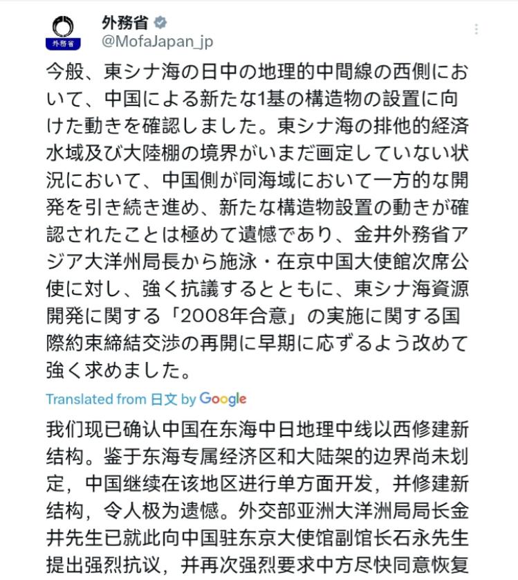 这次轮到日本强烈不满和抗议了!日本要求跟我们启动谈判,我们不予理会!4 月 20 日,日本外务省表示,日方确认中方在东海 “日中地理中间线” 西侧,正推进新建一座设施的相关作业。 日方还老调重弹,说什么在东海专属经济区和大陆架界限还没划定的情况下,中方持续单方面推进开发,现在又有了新建设施的动向,日本对此 “深表遗憾”。 不仅如此,日本外务省亚洲大洋洲局局长金井正彰当天就紧急召见了中国驻日本大使馆公使衔参赞施勇,当面提出了所谓的 “强烈抗议”,还翻出了 2008 年的旧账,再次强烈敦促中方尽早恢复关于落实 “2008 年 6 月东海自然资源合作开发协议” 的谈判。 这已经不是日本第一次在东海问题上跳脚了,但这次的反应明显比之前更急、更激烈,短短一天之内又是发声明又是召见外交官,恨不得把全世界的目光都吸引过来,可结果呢?我们根本就没搭理他们这套。 中国外交部的态度一直非常明确,而且从来没有变过:中方在东海的油气开发活动,全部位于毫无争议的中方管辖海域,完全是中方行使主权权利和管辖权范围内的正当合法行为,中方不接受日方的任何无端指责,也已经驳回了日方这次所谓的抗议。 说白了,我们在自己家的院子里盖房子、搞建设,轮不到隔壁邻居指手画脚,日本所谓的 “抗议”,从法理到现实,没有任何站得住脚的地方。 大家一定要搞清楚一个最基本的事实,日本口中天天挂在嘴边的 “日中地理中间线”,根本就是一个彻头彻尾的伪命题,是日本自己单方面在地图上画出来的一条虚线,中国从来没有承认过,国际社会也从来没有认可过。 在东海划界问题上,中国历来主张按照《联合国海洋法公约》规定的大陆架自然延伸原则来划分,东海大陆架是中国大陆向海洋的自然延伸,一直延伸到冲绳海槽,冲绳海槽深度超过 2900 米,完全符合国际法中切断大陆架的标准,所以冲绳海槽才是中日两国专属经济区和大陆架的真正分界线。 而日本却非要无视国际法和客观地理事实,强行主张用所谓的 “中间线” 来划界。 更可笑的是,上世纪 70 年代以来,中方一直在东海这片海域进行油气勘探开发活动,当时日本方面从来没有提出过任何异议,直到 2004 年,中国春晓油气田开始开发,日本突然发现东海底下藏着海量的石油和天然气资源,一下子就眼红了,这才开始跳出来制造争端,不断对中方的正当活动进行指责和炒作。 从那时候起,日本就形成了一个固定的模式:只要中国在东海有任何正常的建设或者开发活动,日本就一定会跳出来抗议一番,指责中国 “单方面开发”,要求中国停止作业,这么多年下来,日本抗议了多少次,恐怕连他们自己都数不清了。 可结果呢?中国该干什么还是干什么,日本的抗议从来就没有管用过一次,这次也不例外。 日本这次之所以反应这么激烈,除了眼馋东海的资源之外,还有一个更重要的原因,那就是他们眼睁睁看着中国在东海的布局越来越完善,基建速度越来越快,而他们除了动动嘴皮子之外,什么都做不了,这种无力感让他们彻底慌了神。 就在这个月的 2 号和 8 号,日本外务省还盯着这一区域的中国移动式钻探船,对这种再正常不过的作业活动表达了不满,现在又因为一座新设施的建设就急成这样,足以看出日本现在的焦虑已经到了什么程度。 要知道,这已经是日本方面确认到的第 22 座此类设施了,每一座设施的建成,都意味着中国对东海这片海域的管控和开发能力又上了一个台阶,而日本只能在旁边干瞪眼,连一颗螺丝钉的安装都阻止不了。 日本心里很清楚,再这么下去,他们在东海问题上的话语权只会越来越弱,最后只能彻底被边缘化,所以他们才会急着翻出 2008 年的旧协议,要求重启谈判,妄图通过谈判来拖延中国的开发进度,甚至从中分一杯羹。