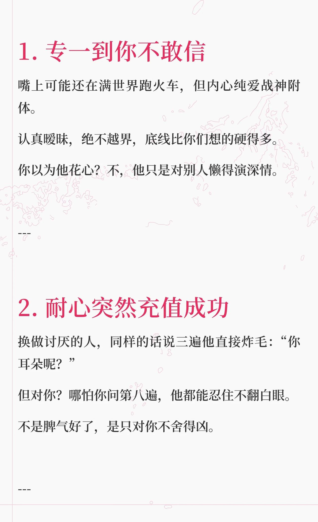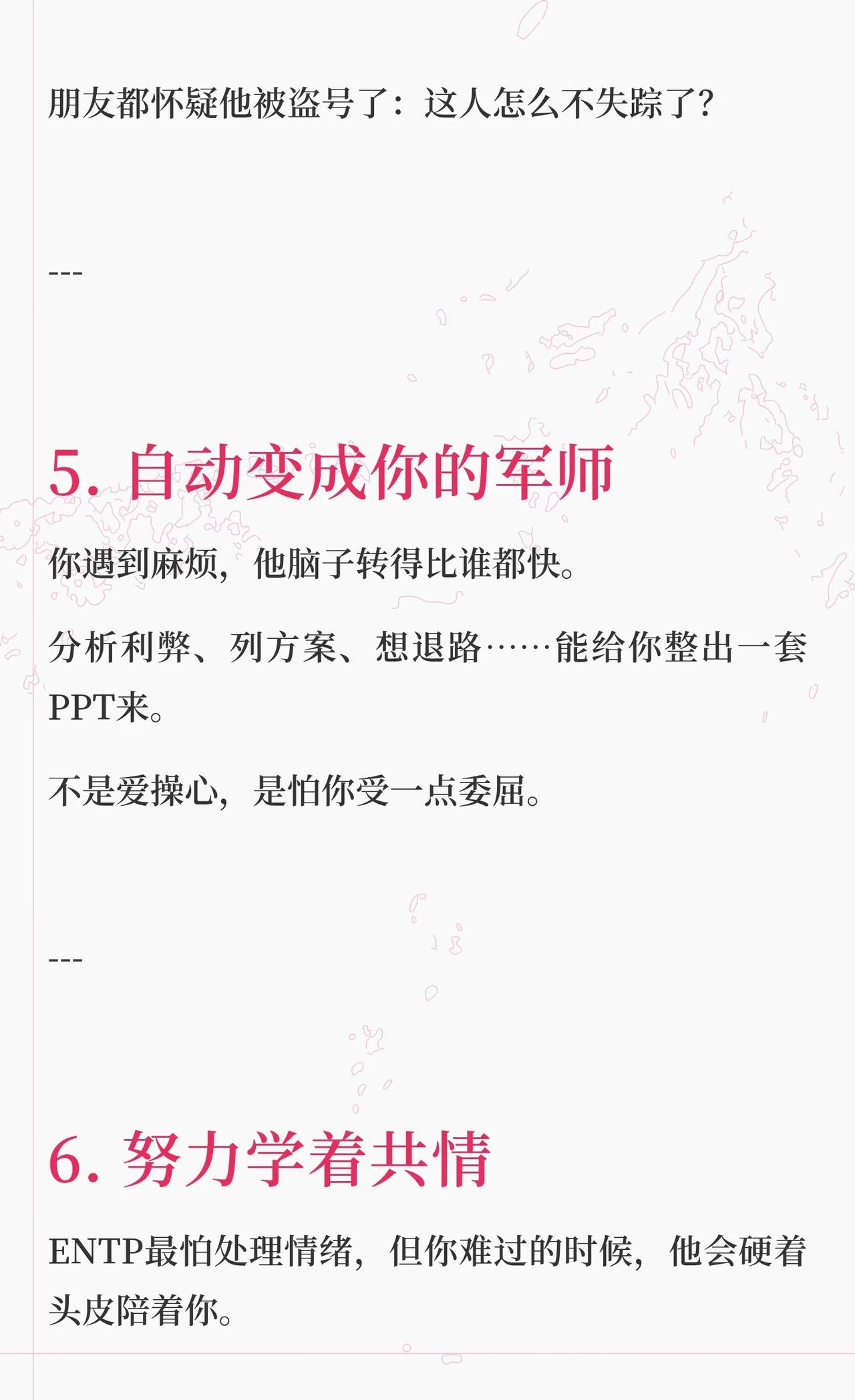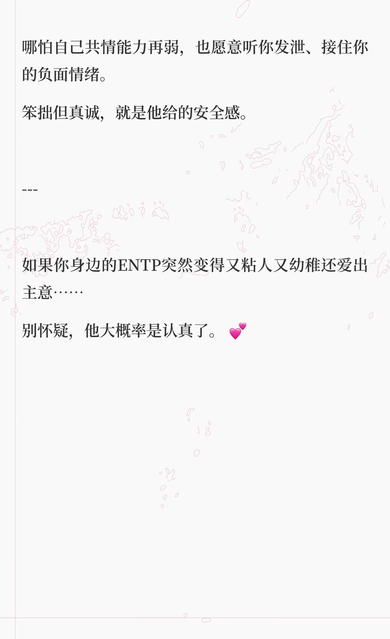 ENTP 骨折眉爱上你的表现 ENTP在喜欢你时会变得专一、耐心、黏人,甚至学着共情。他故意逗你、分析问题、陪你难过,只为给你安全感。如果你发现他突然变得又粘又幼稚,那他大概率是认真的。ENTP MBTI 骨折眉 entp喜欢一个人的表现