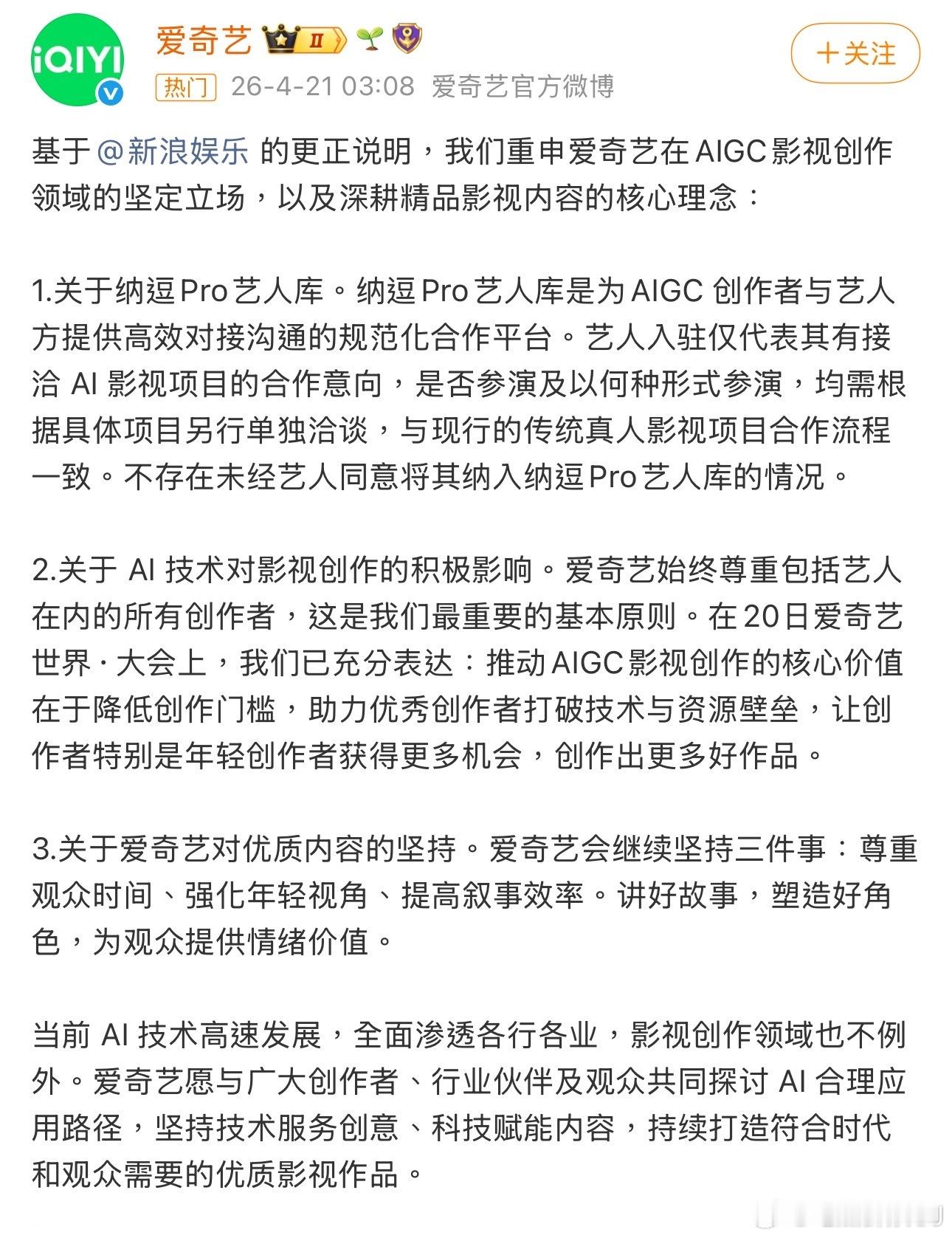爱奇艺也回应并再次强调:艺人库里提及的艺人之前都是有合作意向且同意入驻的,绝无未经同意擅自纳入的情况发生。