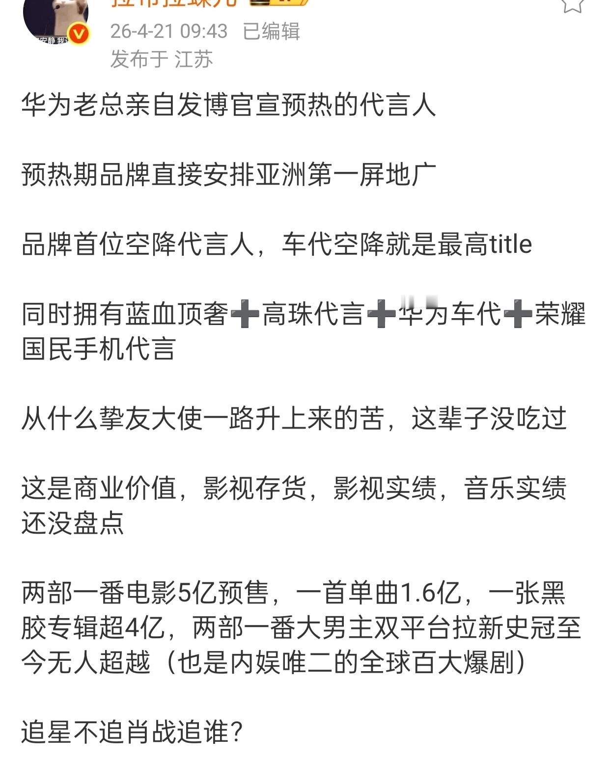 肖战 尚界这可是车代,还是预热。好多好多晒单肖战商业号召力永远超乎想象!真财神爷