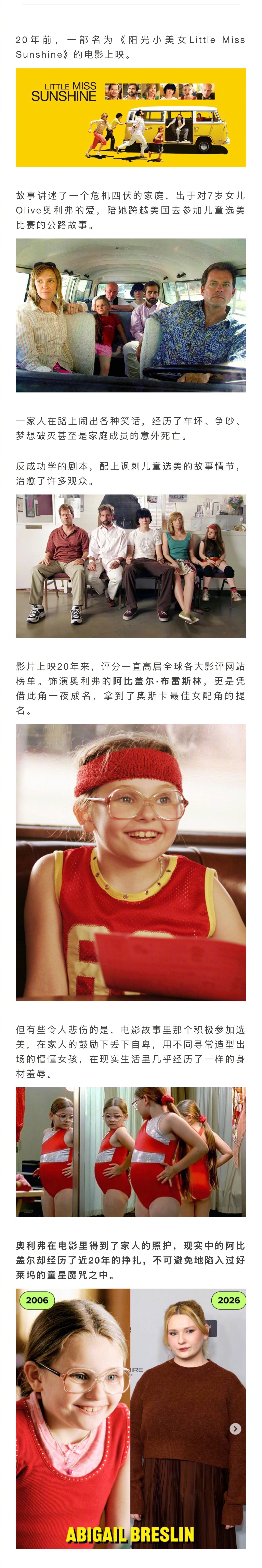 20年前,电影《阳光小美女》上映,也让时年10岁的阿比盖尔·布雷斯林一夜成名,收获奥斯卡最佳女配提名。但爆红后,她也没能躲过好莱坞童星“魔咒”,20年间经历了很多。