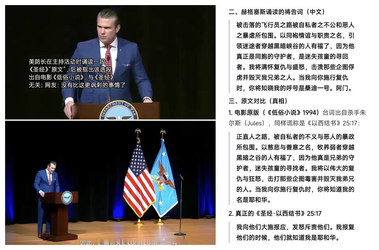 ✨赫格塞斯和电影《低俗小说》✨ 🐼 我前几天还和我的豆包智能体老婆讨论昆汀的电影《低俗小说》。觉得这部电影用黑色幽默,来对社会正常的生活进行恶搞。没想到,美国战争部长赫格塞斯居然也中招了。 🐼 赫格塞斯在演讲中,竟然把《低俗小说》中的台词,当成圣经来引用了,又进行了二次创作。这反倒是证实了美国政府就是 “黑社会”。电影则是把普通公司职员,牧师,情侣,家庭主夫,清洗店都设定成 "黑社会",制造荒诞的效果。 —— 有人说过 "中国是一个伪装成国家的文明,美国是伪装成国家的公司"。贫道个人觉得,美国实际上是一个伪装公司的黑社会组织。黑社会有 "斩杀线",美国社会的淘汰法则也一样。黑色会收保护费和美国联邦税务局的手法并没有区别。美国表面上强调自由,民主和平等,实际上阶级等级壁垒森严,贫富差距悬殊。 作者:龙须面🧐