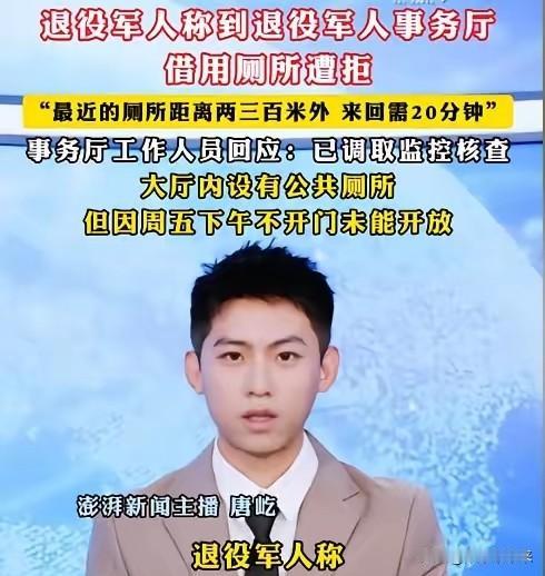 一位右腿残疾的退伍老兵,想进退役军人事务厅借个厕所,要经历多少波折? 答案是,他要忍着身体的不适,对着保安反复说明自己腿脚不便的难处;要在大厅工作人员已经同意的情况下,依旧被拦在门外;要在拿出手机记录时,被人上前抢夺手机;最后要等对方报警,民警赶到现场协调,才终于解决了如厕的燃眉之急。 这件事发生在2026年4月17日的湖南长沙,当事人周先生是一名退伍老兵,右腿因救人致残,日常出行全靠拐杖支撑。事发当天,周先生突发内急,周边最近的公共厕所,要绕行数百米,还得跨过高架桥,往返一趟要二十多分钟,这对拄拐的他来说,根本难以完成。抬眼看到湖南省退役军人事务厅的事务大厅,他想着这里本就是退役军人的“娘家”,进去借个厕所,应是情理之中的事。 走进大厅后,现场的工作人员已经应允了他的请求,可门口值守的保安却始终不肯放行,以周五下午是内部整理时间、不对外开放为由,执意拒绝他使用内部厕所。周先生放低姿态反复解释,言语里满是恳求,可保安的态度没有半分松动,始终用一句规定,把他挡在门外。 更让人意外的是,周先生拿出手机,想要记录下现场的情况,保安见状竟直接上前,试图抢夺他的手机。双方争执不下,保安最终选择了报警,甚至在民警到场后,抢先声称周先生强行闯入、扰乱办公秩序。直到周先生拿出录制的视频证据,还原了事情始末,民警当场协调,这位残疾老兵,才终于走进了厕所。 事件在网络上传播开后,无数人都为这位老兵的遭遇感到不平。4月20日,湖南省退役军人事务厅发布官方回应,承认保安行为失当,向周先生致歉并获得了谅解,涉事两名保安已被解除劳务关系,相关科室负责人被通报批评,全厅同步开展作风整顿,后续将优化管理流程,保障退役军人的合理需求。 退役军人事务厅,设立的初衷,就是为退役军人服务,做他们可以放心依靠的“娘家”。墙上“情系老兵、真诚服务”的标语,不该只是一句口号。制度定的是行事的准则,却不该成为隔绝善意与体谅的高墙。面对曾为家国流血奉献的人,面对伤残人士的紧急需求,规则的执行,本就该多一份人性化的考量。 服务的根本,是以人为本。唯有把尊重落到每一件小事上,才能让“娘家”二字,不负老兵的信赖。